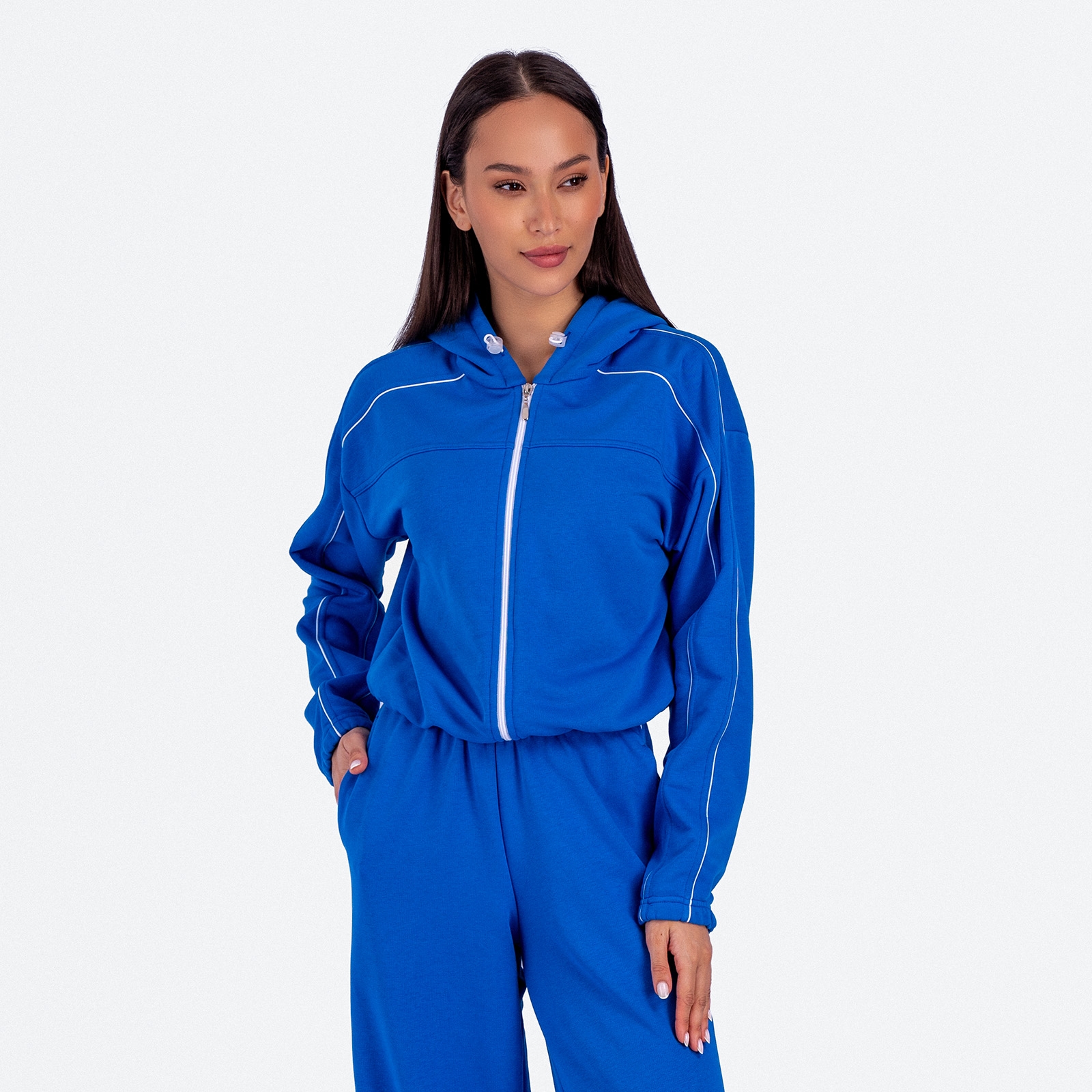 Женская укороченная толстовка с капюшоном и декоративными кантами.Материал: