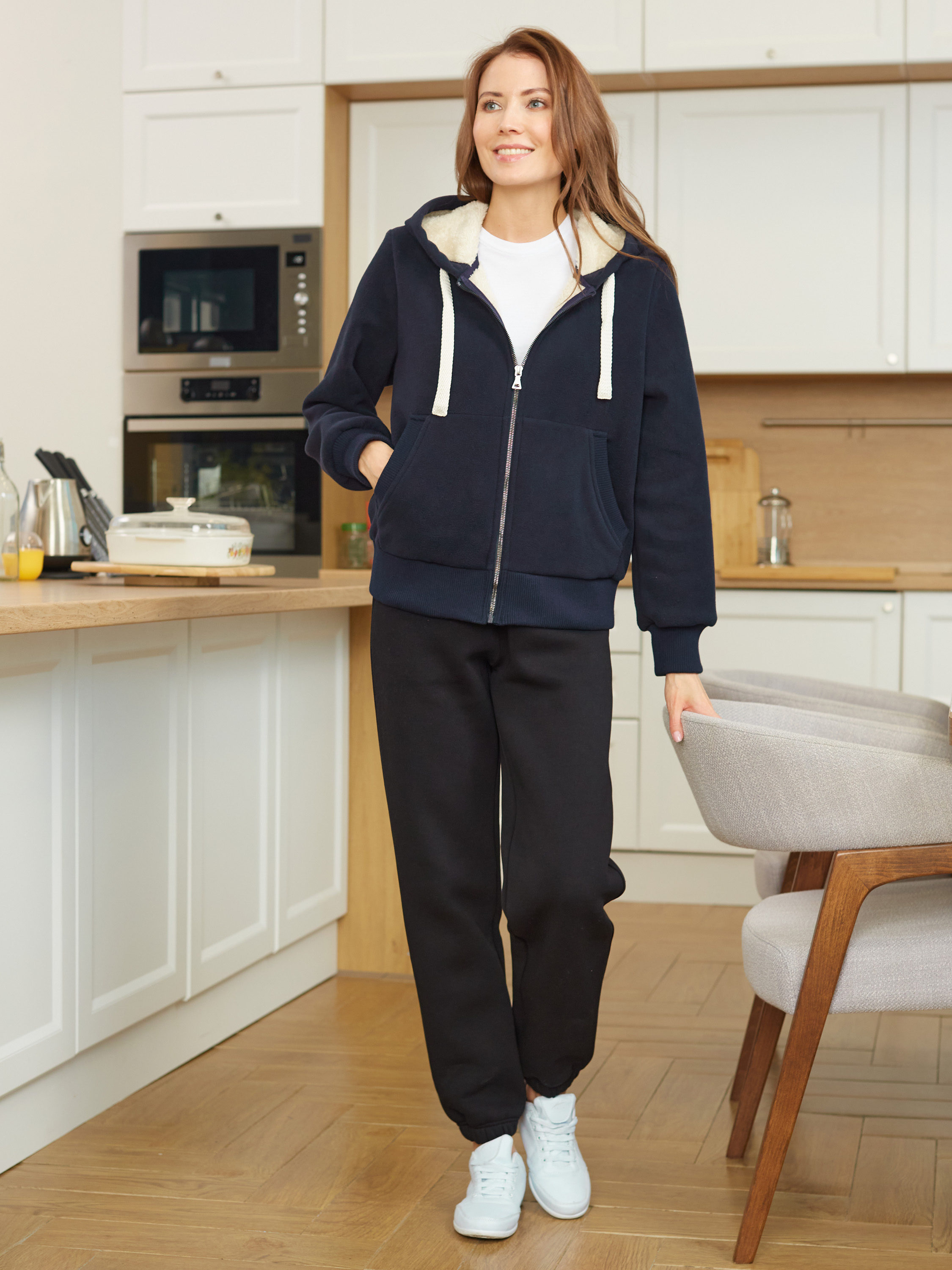 Толстовка женская из плотного флиса, дублированного мехом. Изделие с удобным капюшоном, низ тостовки заужен трикотажным поясом. Карманы "кенгуру". Застегивается на молнию. Рукава втачные, с эластичными манжетами. 100% полиэстер