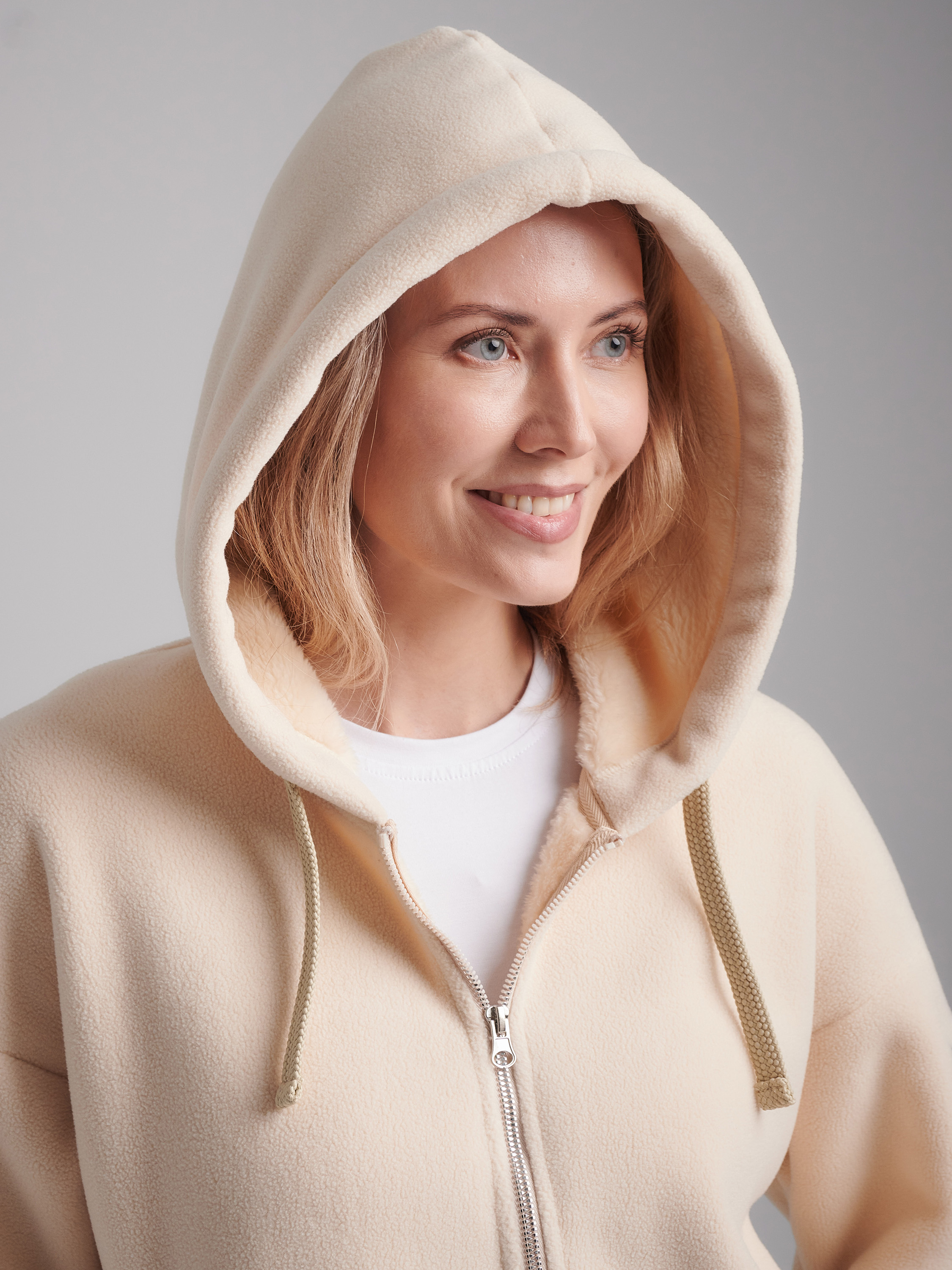 Толстовка женская из плотного флиса, дублированного мехом. Изделие с удобным капюшоном, низ тостовки заужен трикотажным поясом. Карманы в боковых рельефах. Застегивается на молнию. Рукава втачные, с эластичными манжетами. 100% полиэстер