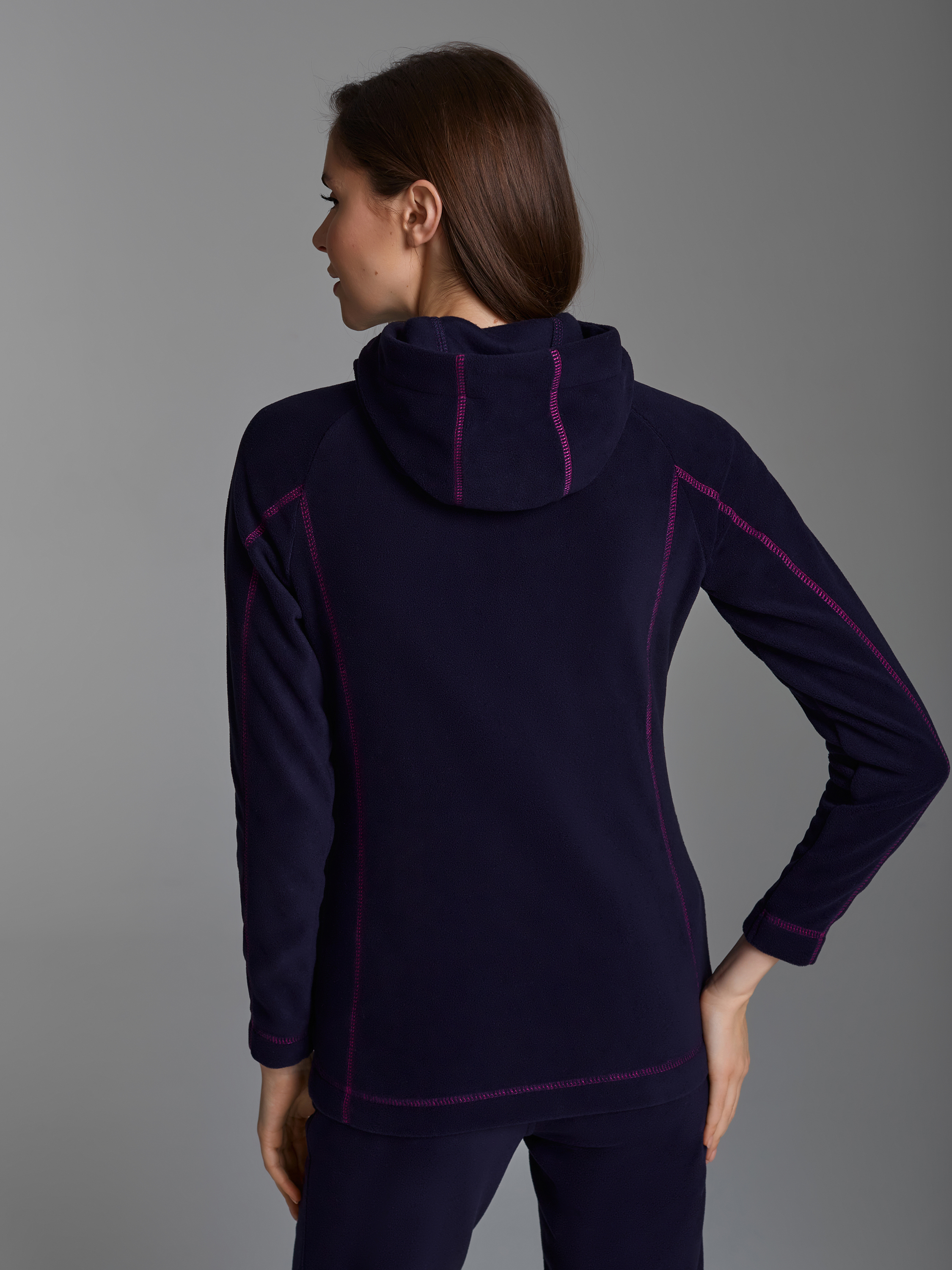 Толстовка женская из флиса с капюшоном, застегивается на молнию. Силуэт изделия – полуприлегающий. Рукава покроя реглан. Рельефы и кокетки толстовки подчеркнуты контрастной отстрочкой. Карманы куртки прорезные, с планками на молниях. 100% полиэстер
