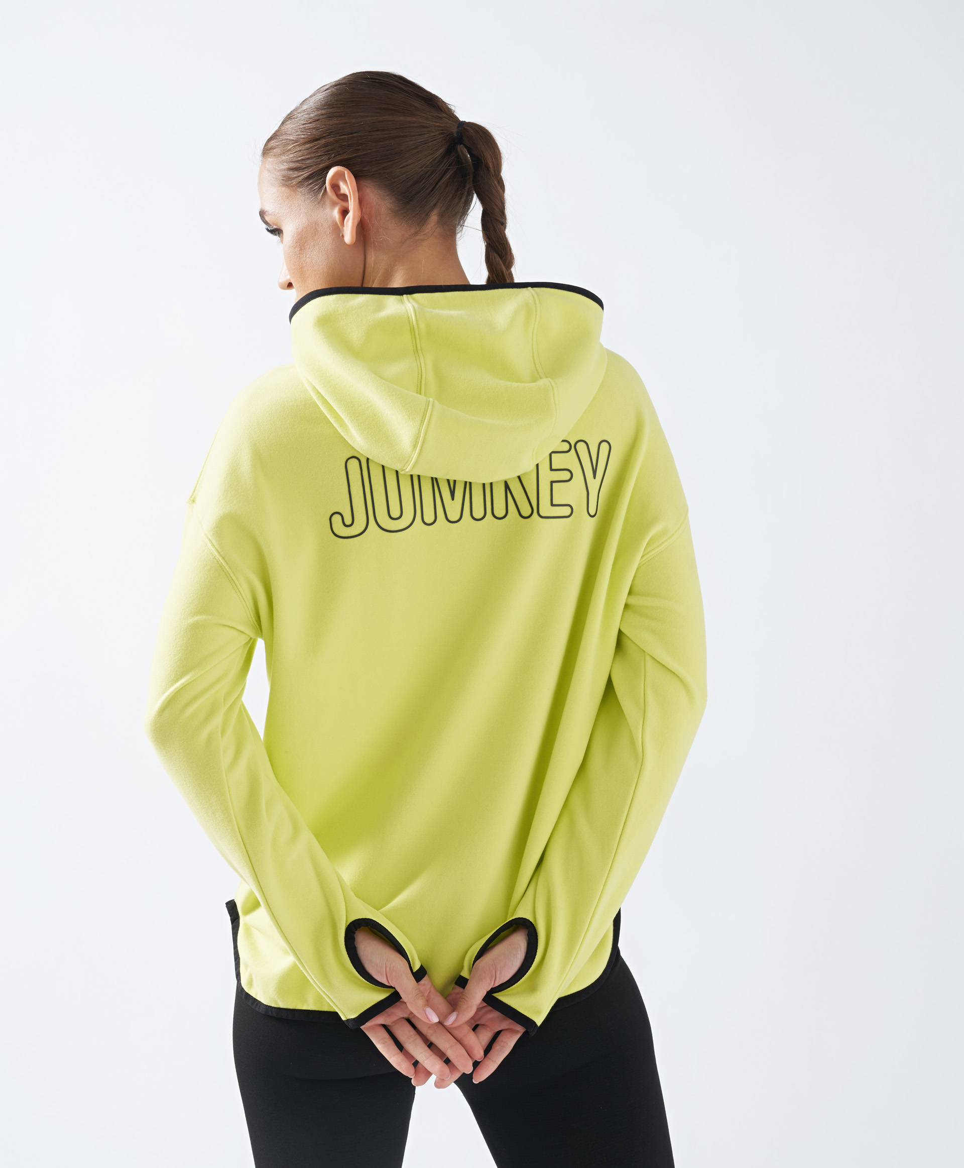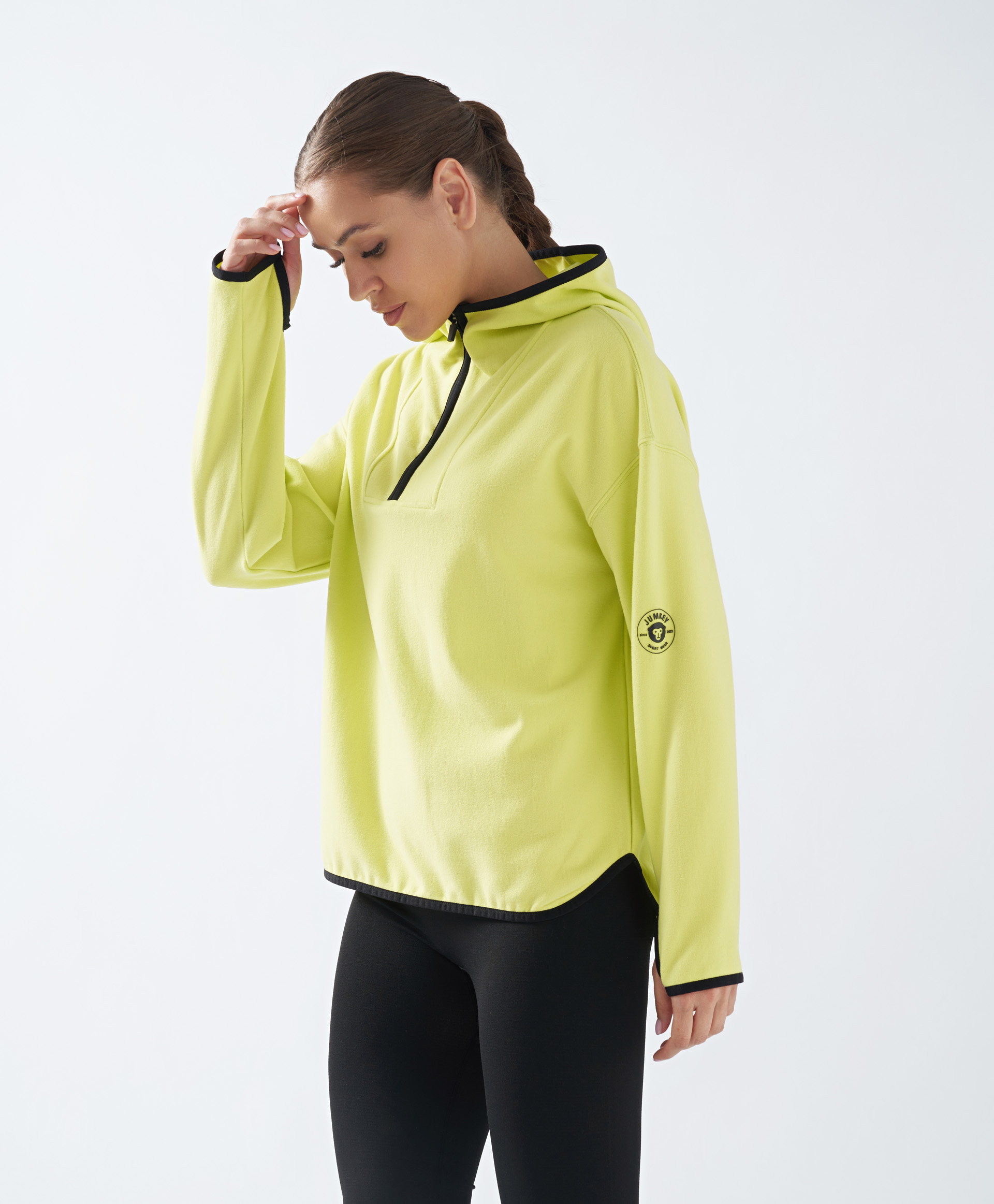 Салатовая флисовая толстовка с молнией на вороте и капюшоном для женщины Jumkey. Это модель влюбляет в себя с первого прикосновения. Ультрамягкий тонкий трикотажный флис отличается особенной нежностью, легкостью, теплом, хорошей растяжимостью, износостойкостью. Кофта с капюшоном защитит голову от ветра, а молния на высоком воротнике согреет шею. Передняя часть изделия чуть короче спинки, а на рукавах-митенках имеются прорези для пальцев, чтобы рукава ветровки не задирались, а ладони всегда были в тепле. Это изделие отлично подойдет как для занятий спортом, так и для комфорта и уюта на каждый день. Модности добавляет яркий салатовый оттенок, дополненный контрастными черными кантами. На спинке толстовки красуется название бренда, а на рукаве - небольшая лейба.
