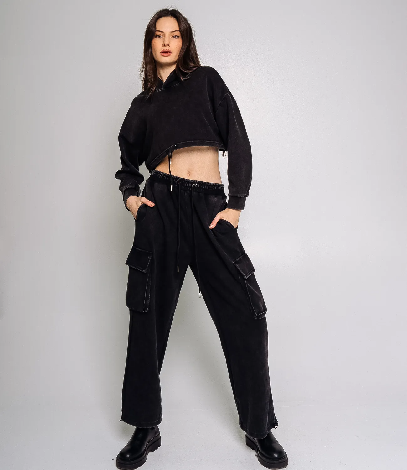 Хлопковый спортивный костюм отличное решение для занятия спортом или просто прогулки. Укороченная кофта с капюшоном и брюки карго отлично дополняют друг друга и дарят комфорт. Хлопок