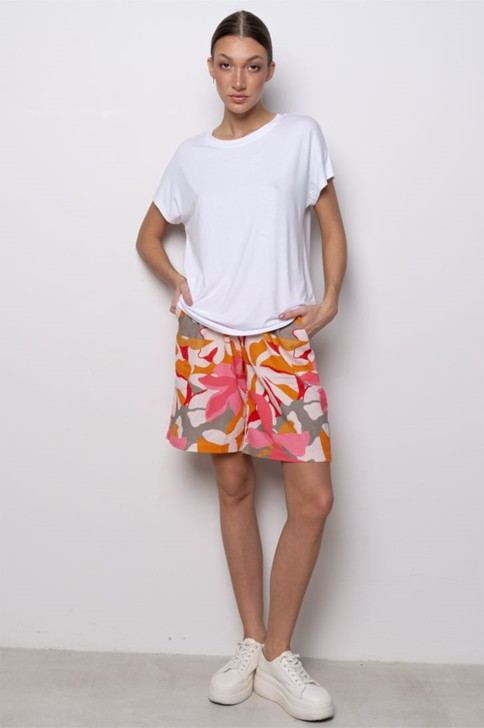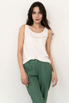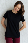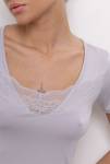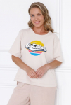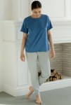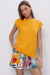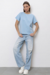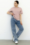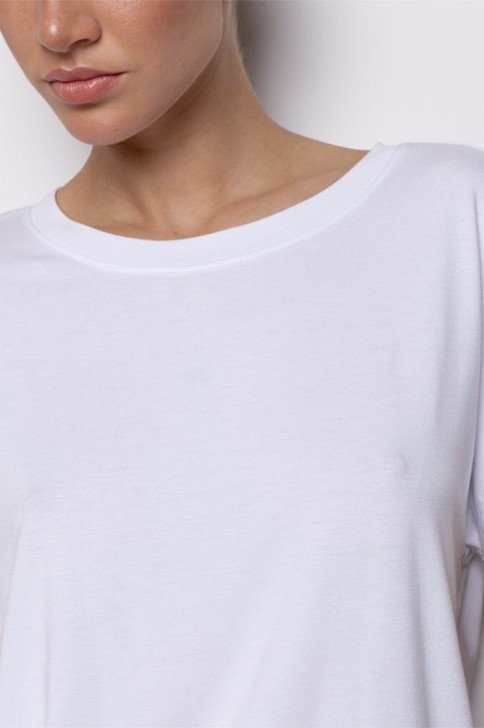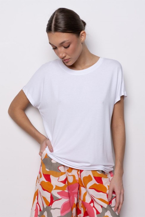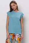 "Футболка свободного прилегания из нежной и струящейся вискозы. Вырез горловины лодочкой, рукав спущен.