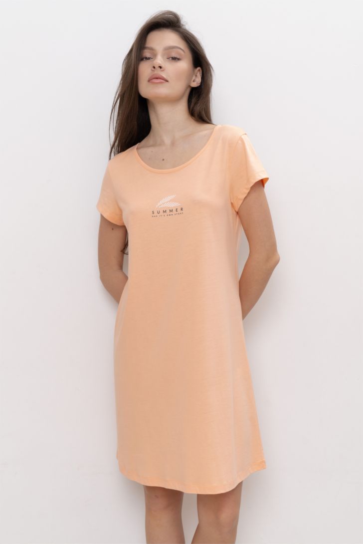 Сорочка-футболка с коротким рукавом свободного прилегания. Вырез горловины круглый, обработан обтачкой из основного полотна. Модель представлена в двух цветовых решениях.