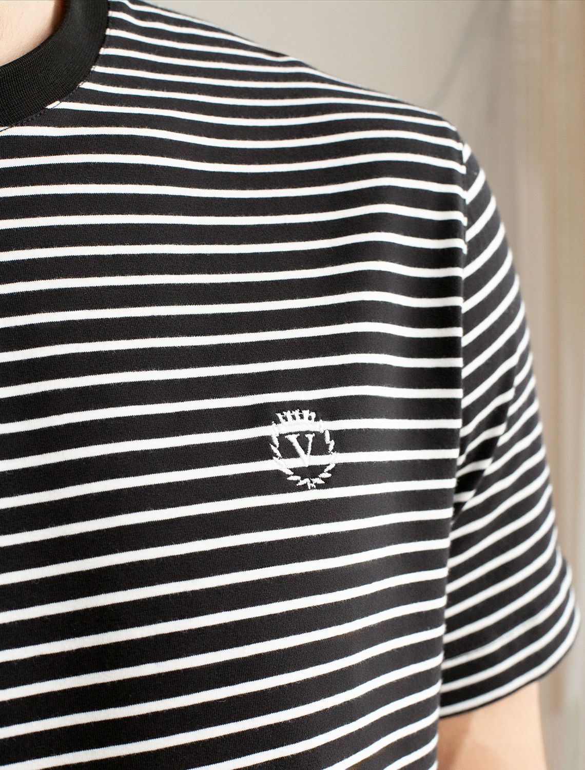 Футболка выполнена из премиального хлопка. Особым преимуществом является наличие эластана в составе изделия. Очень приятная на ощупь и комфортная при носке, футболка сохранит свой безупречный внешний вид в течении долгого времени. Модель дополнена лаконичной вышивкой с буквой V и логотипом бренда из эко-кожи.