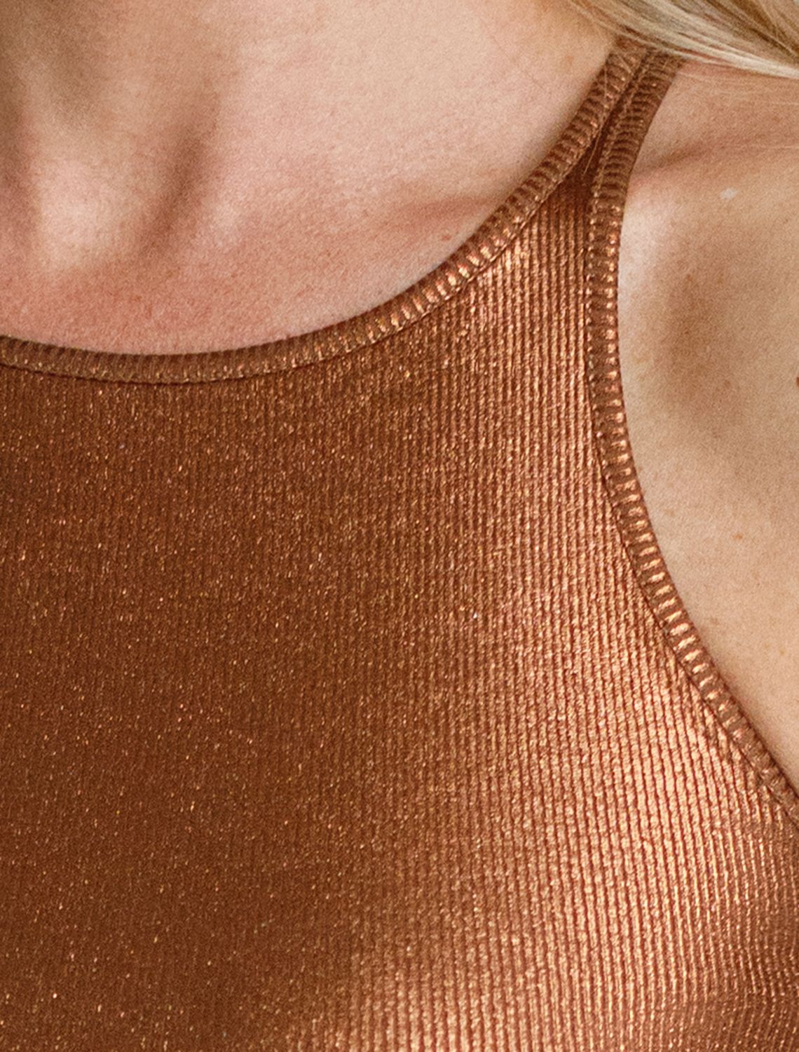 Эффектный топ кофейного цвета из мягкого хлопка с эластаном представлен в стильном исполнении с матовым бронзовым покрытием металлик с серебристыми вкраплениями. Мелкий рубчик визуально вытягивает силуэт и подчеркивает фигуру, делая образ более стройным и аккуратным. Круглый ворот и суженные лямки акцентируют внимание на линии ключиц, делая образ утонченным и изысканным, Благодаря деликатному блеску топ подходит для тех, кто ценит утонченность и стремится добавить в образ немного сияния без перебора - это отличный вариант топа для любительниц минимализма.