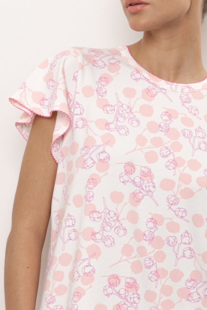Нежная сорочка с круглым вырезом горловины, рукавами «крылышки» комфортной длины. Модель представлена в 4-х цветовых решениях. Однотонные варианты декорированы тематическим принтом. Горловина и низ рукавов декорированы