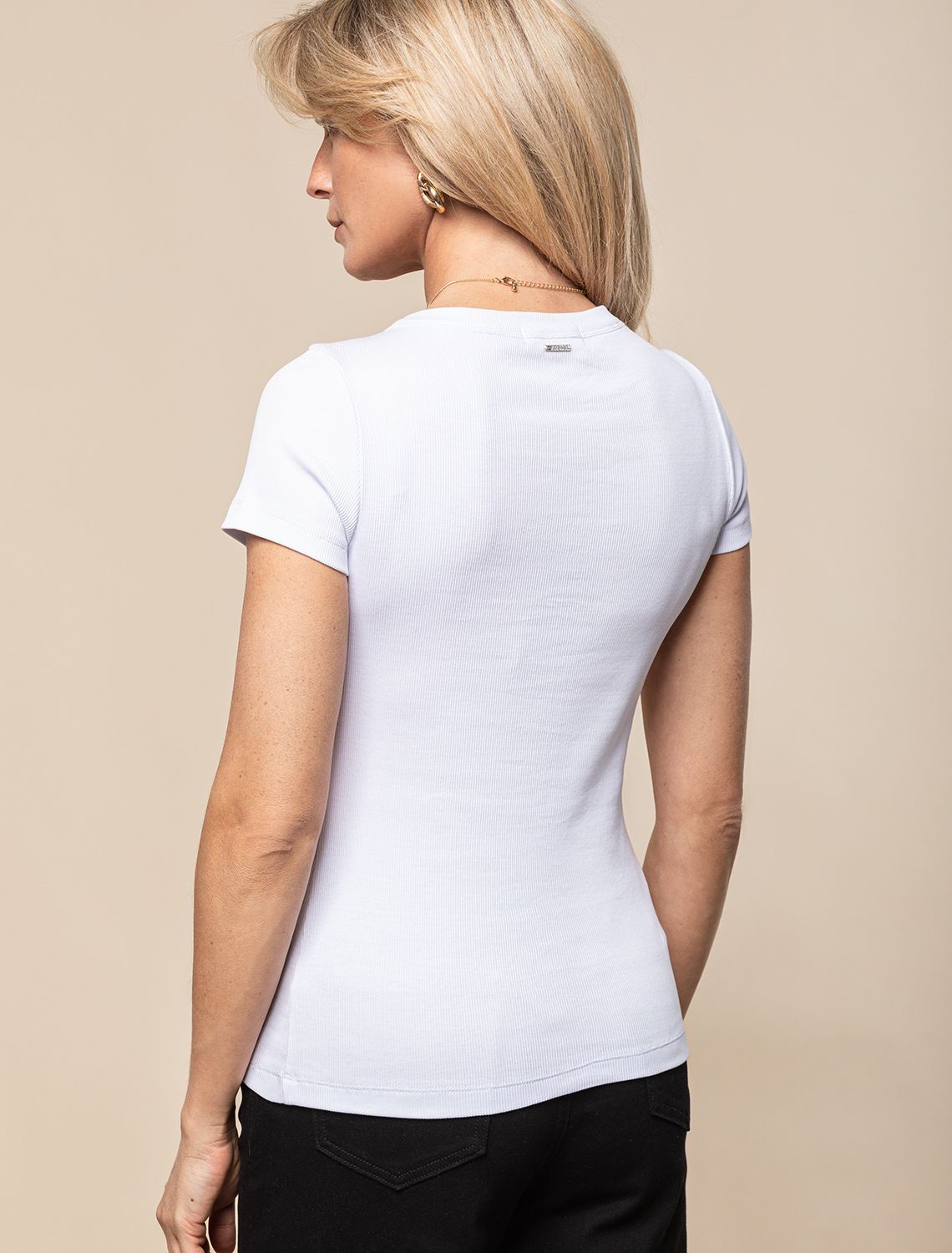 Футболка с круглым вырезом выполнена из фактурного трикотажа в рубчик. Модель идеально сидит по фигуре не сковывая движения. Хлопковый трикотаж поддерживает оптимальную температуру тела, поэтому в изделии будет комфортно в течении всего дня. Наличие эластана в составе гарантирует формоустойчивости. Базовая модель впишется в любой гардероб и подойдет для офисного дресс-кода.