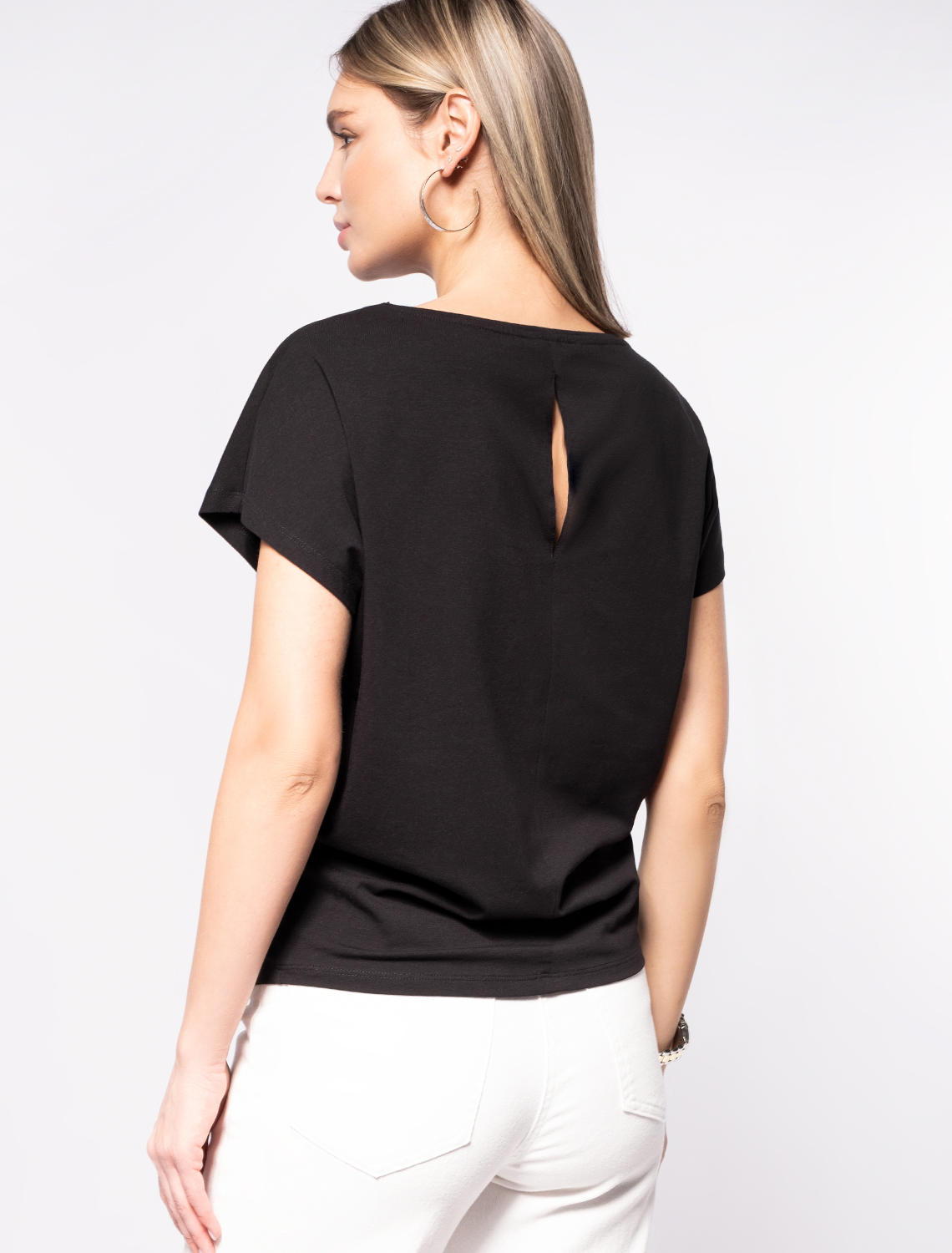 Ст.цена 1190р Футболка из хлопкового облегченного полотна с авторским принтом D49.020 черный_коралл