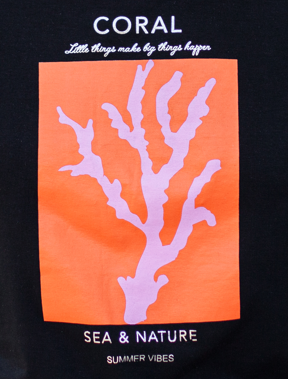 Перевод надписи: «Coral, little things make big things happen, sea and nature, summer vibes - корал, балгодаря маленьким вещам происходят большие события, море и природа, летнее настроение»