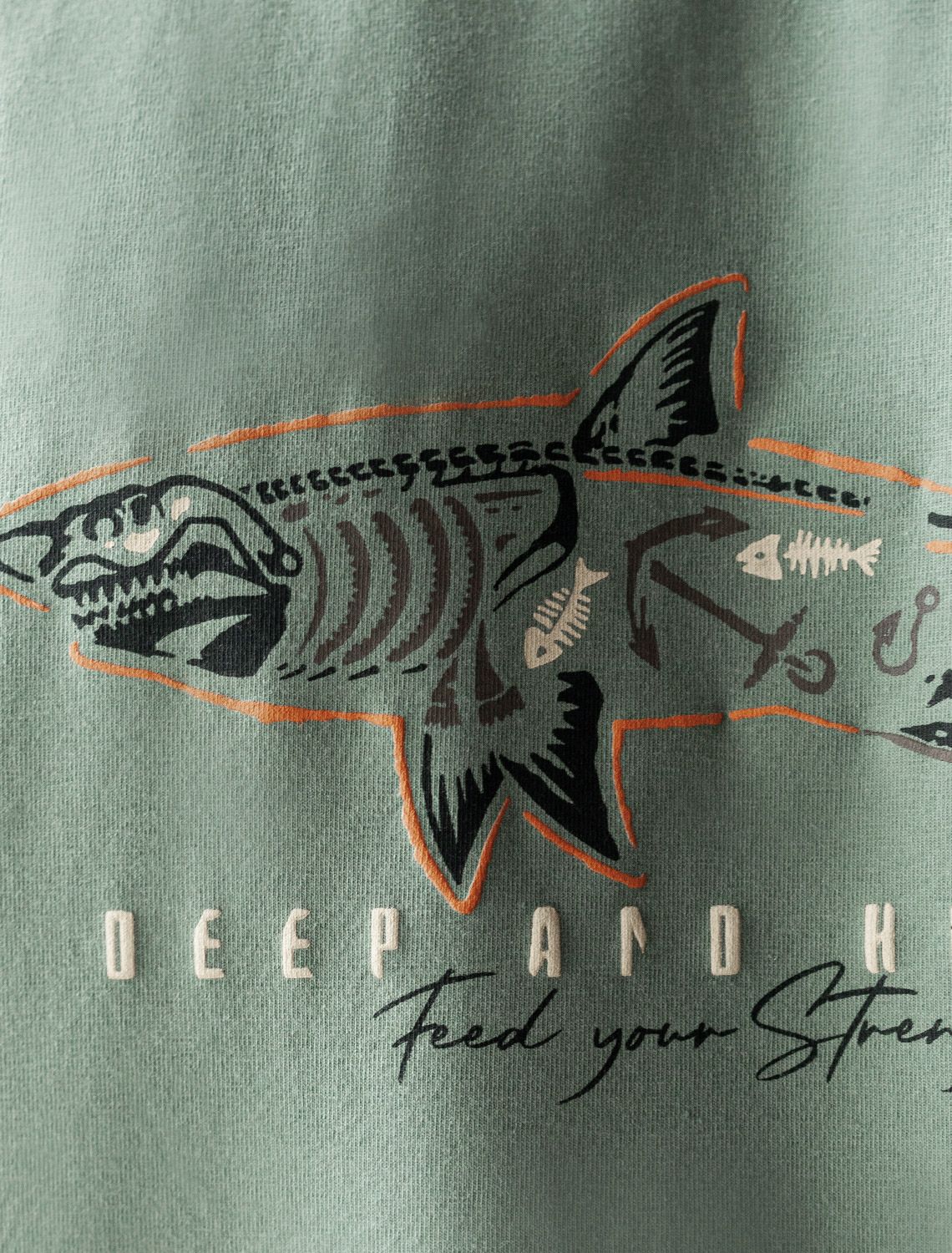 Перевод принта: deep and hungry, feed your strength - голодный обитатель глубин, укрепляй свою силу. Футболка выполнена из премиального хлопка с эластаном. Авторский принт нанесен фактурными красками с устойчивым покрытием. Изделие комфортно сидит по фигуре, не сковывая движений. За счет среднего объема, хорошо подойдет как первый слой под пиджак, кардиган или бомбер. На рукаве нашивка из эко-кожи с логотипом бренда.