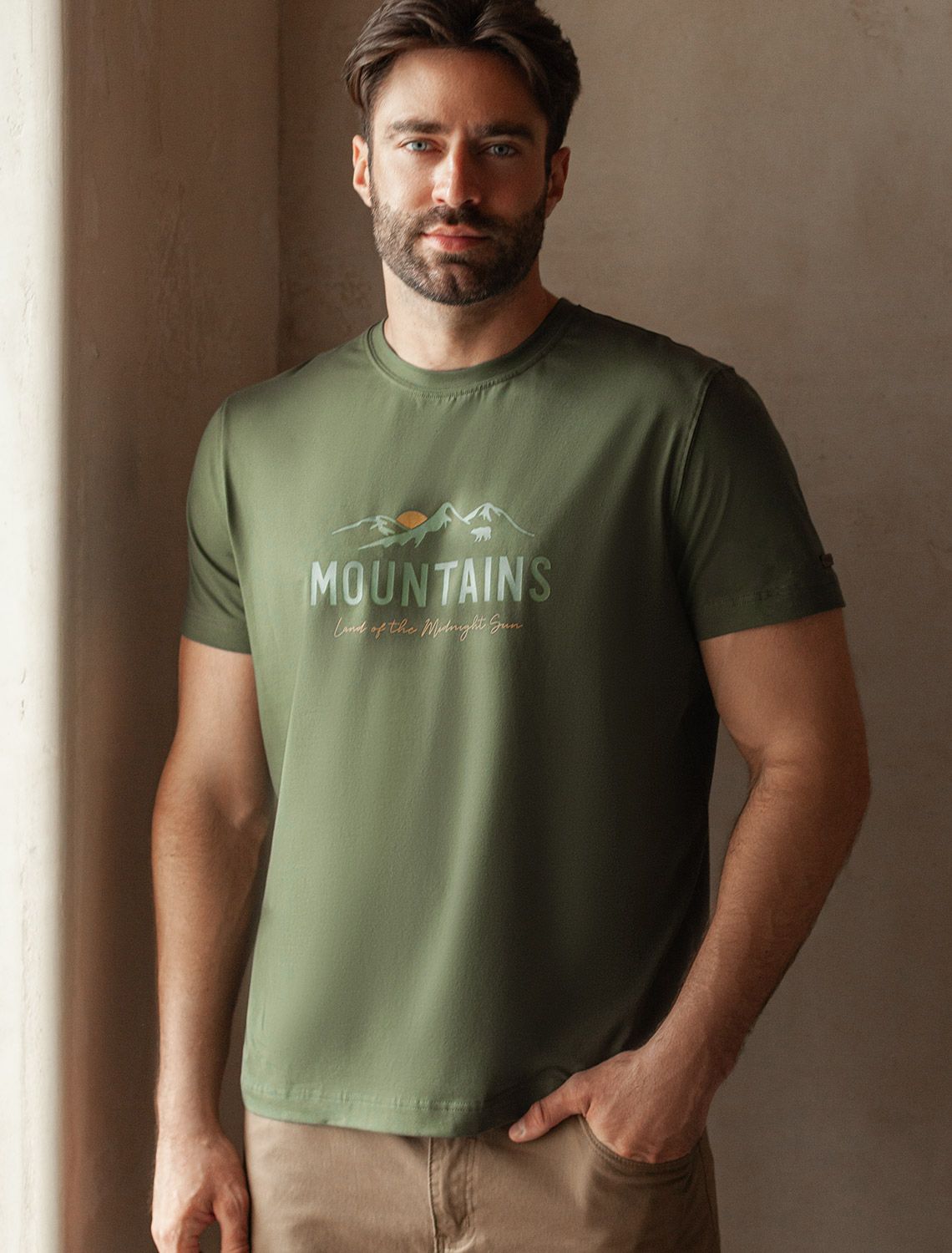 Ст.цена 1190р Футболка из премиального хлопка с авторским принтом U49.045 т.оливковый_горы