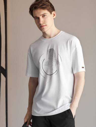 Футболка свободного кроя выполнена из премиального хлопка. Авторский принт нанесен красками с устойчивым покрытием. Благодаря эластану, носить изделие очень комфортно, и оно сохранит свой безупречный вид в течение долгого времени. На рукаве нашивка из эко-кожи с логотипом бренда.