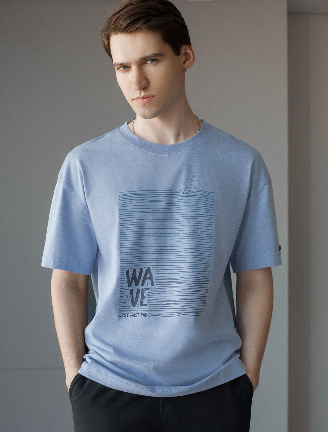 Ст.цена 1190р Свободная футболка с авторским принтом U49.048 голубой меланж_wave
