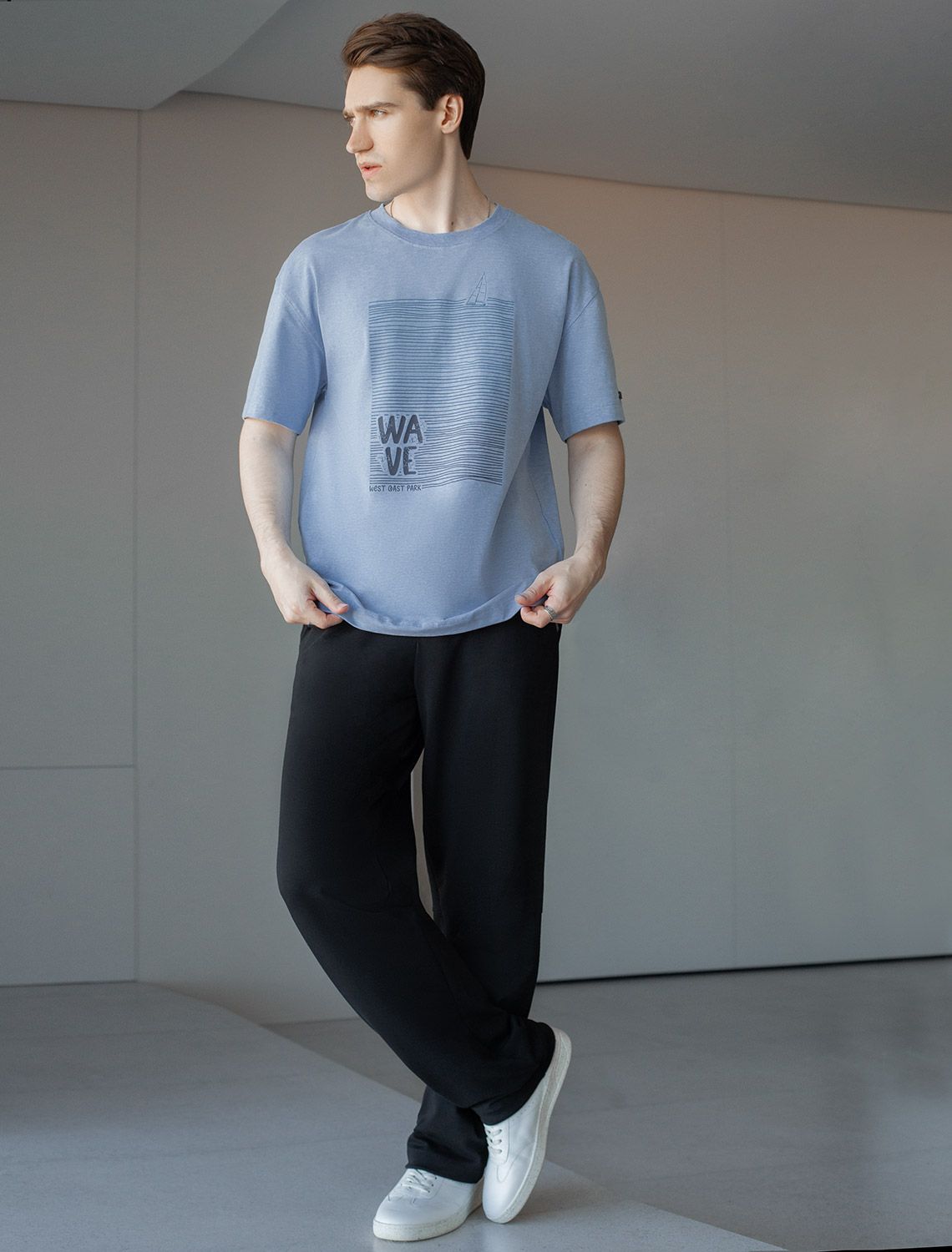 Перевод принта: Wave west cost park - волна, парк западного побережья. Футболка свободного кроя выполнена из премиального хлопка. Авторский принт нанесен красками с устойчивым покрытием. Благодаря эластану, носить изделие очень комфортно, и оно сохранит свой безупречный вид в течение долгого времени. На рукаве нашивка из эко-кожи с логотипом бренда.