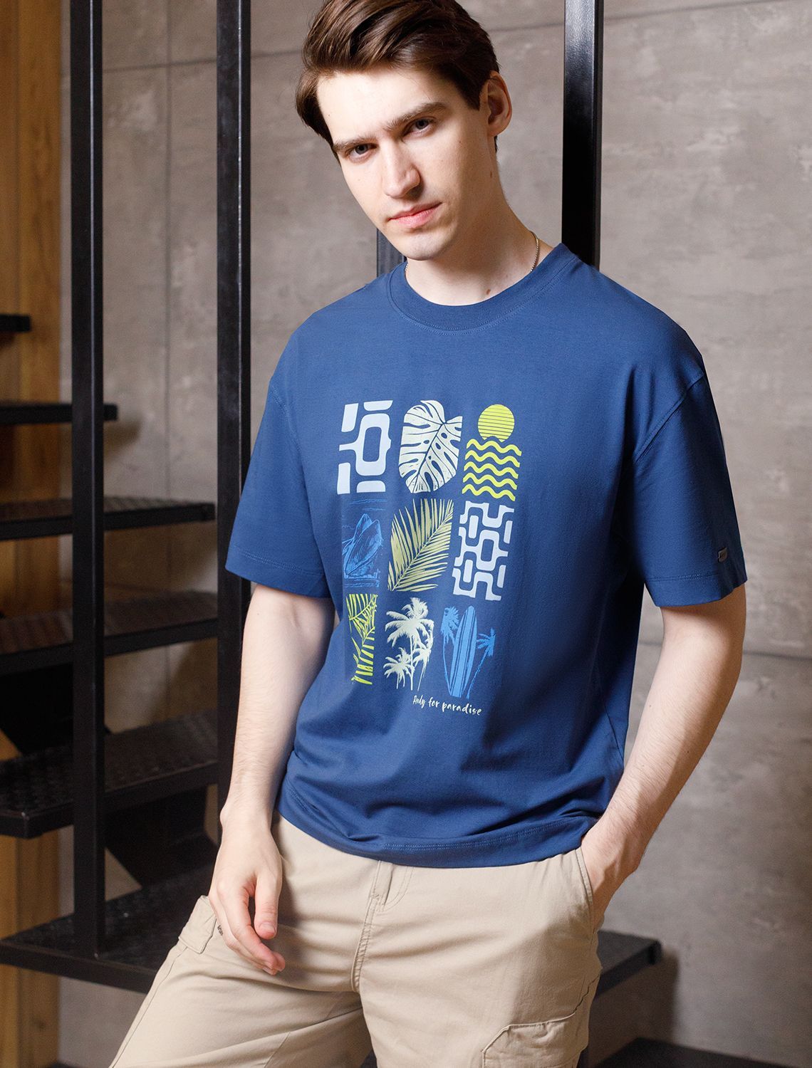Перевод принта: Ready for paradise - готов к райскому отдыху. Футболка свободного кроя выполнена из премиального хлопка. Авторский принт нанесен красками с устойчивым покрытием. Благодаря эластану, носить изделие очень комфортно, и оно сохранит свой безупречный вид в течение долгого времени. На рукаве нашивка из эко-кожи с логотипом бренда.