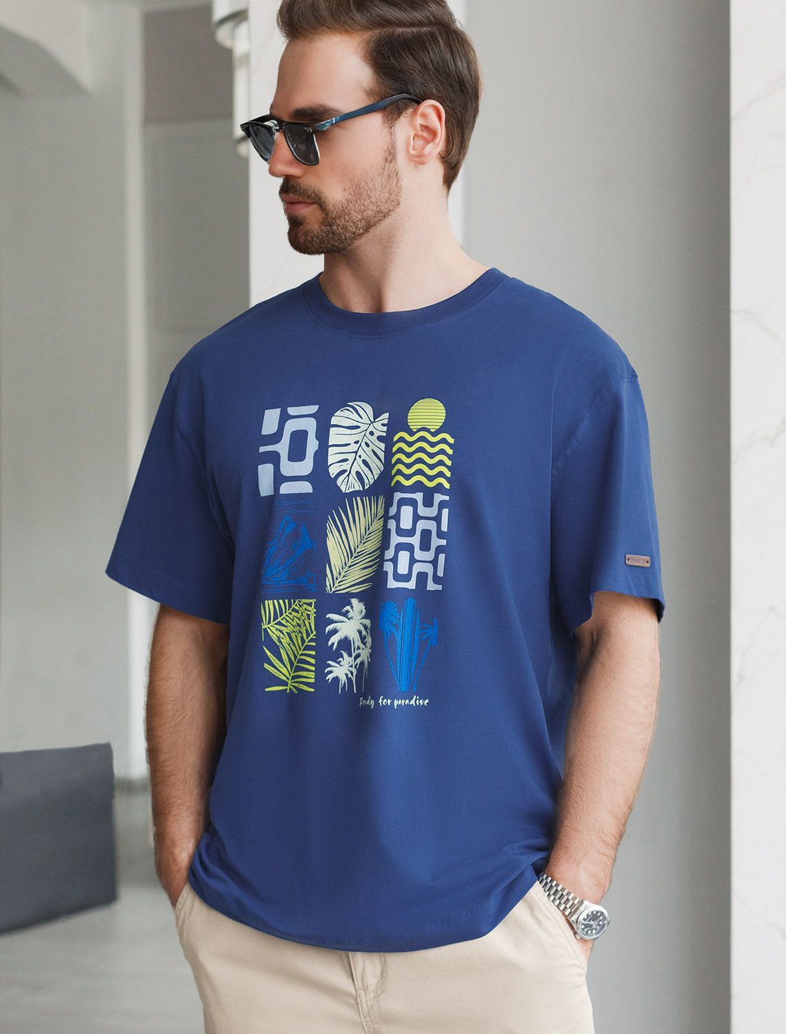 Перевод принта: Ready for paradise - готов к райскому отдыху. Футболка свободного кроя выполнена из премиального хлопка. Авторский принт нанесен красками с устойчивым покрытием. Благодаря эластану, носить изделие очень комфортно, и оно сохранит свой безупречный вид в течение долгого времени. На рукаве нашивка из эко-кожи с логотипом бренда.