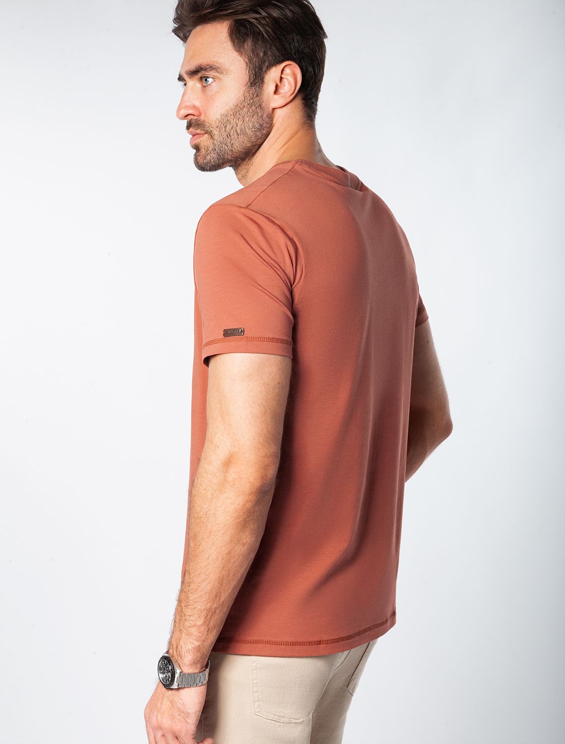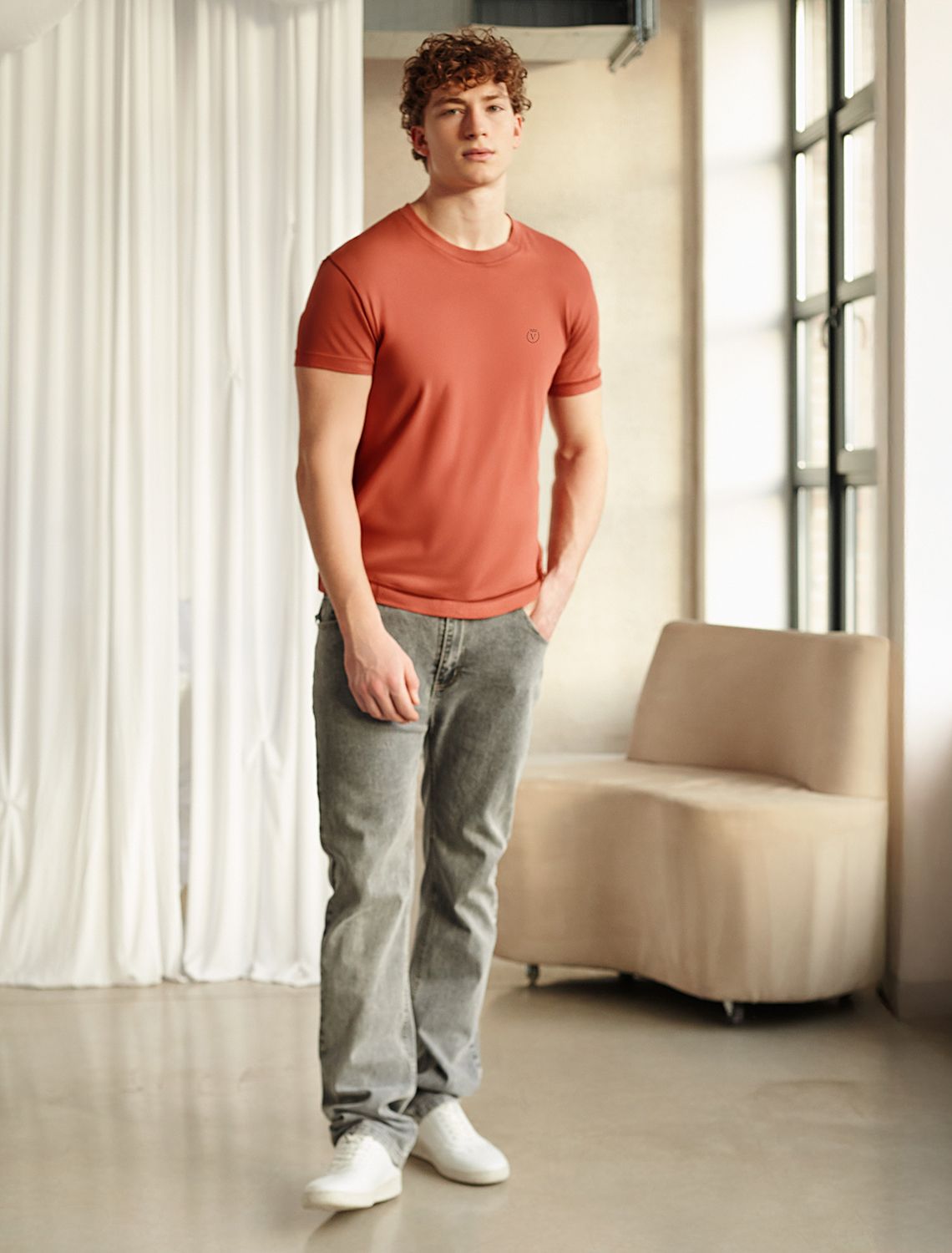 Базовая футболка кирпичного цвета с эффектом меланж из премиального хлопка с эластаном полуприлегающего кроя станет универсальным решением для любого случая. Прямой крой обеспечивает комфортную посадку на любую фигуру, включая большие размеры, подходит как на низкий, так и на высокий рост. Выполненная из натуральной ткани, она обладает дышащими свойствами, а за счет эластичности сохраняет форму даже после длительного ношения и многочисленных сирок.