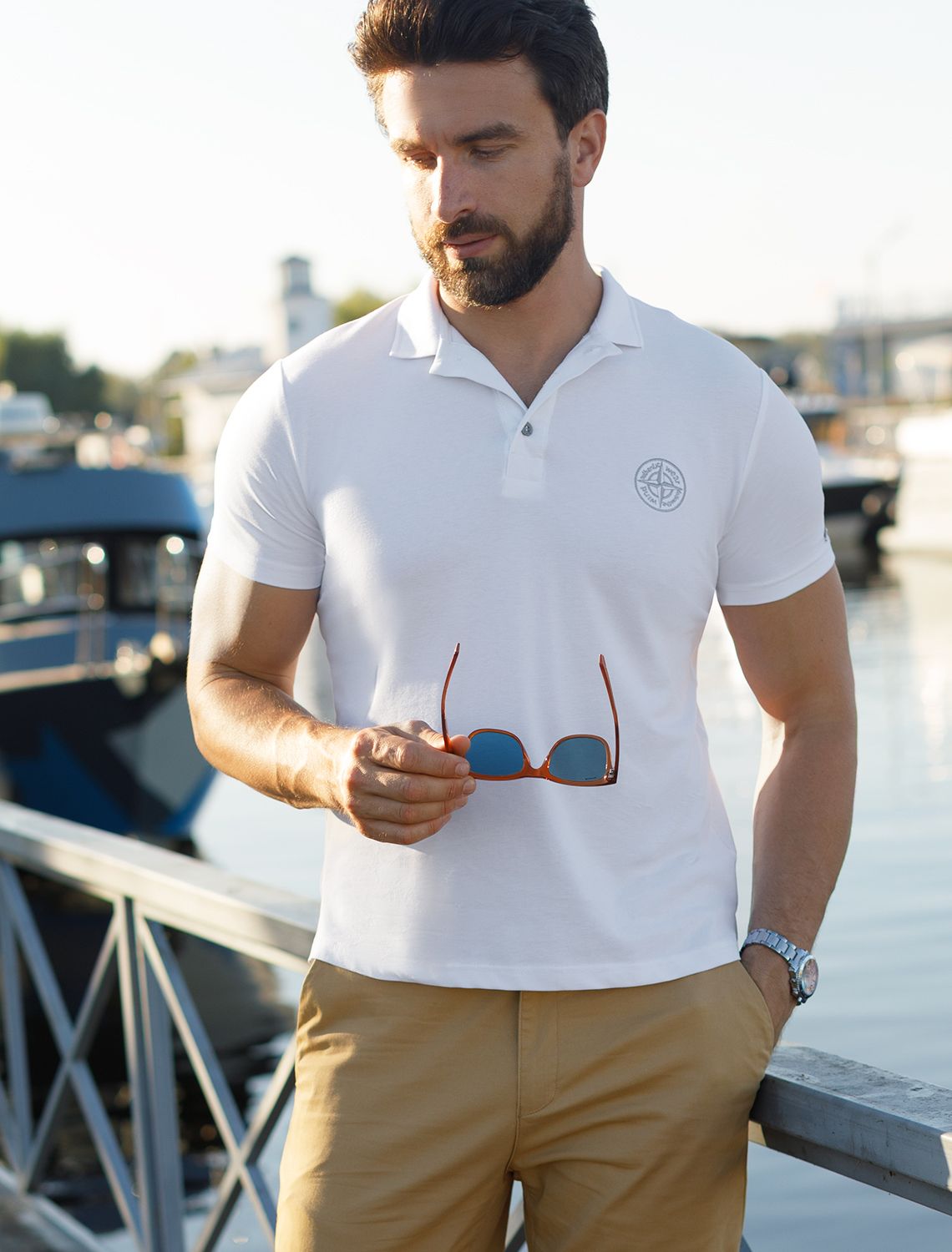 Футболка-поло выполнена из фактурного трикотажа. Модель с прямого кроя с небольшими разрезами по бокам дополнена вязаным воротником вышивкой с компасом. Премиальный хлопковый трикотаж гарантирует комфорт и износостойкость. На рукаве брендированная металлическая нашивка.