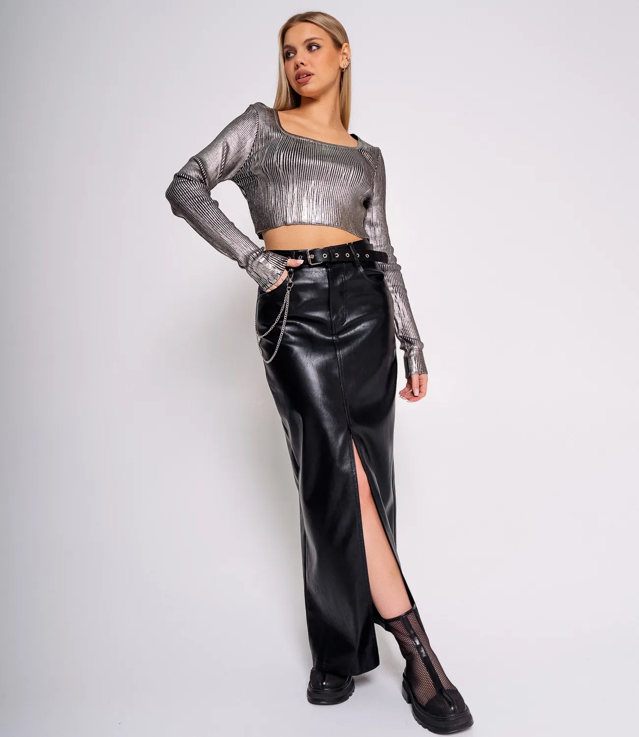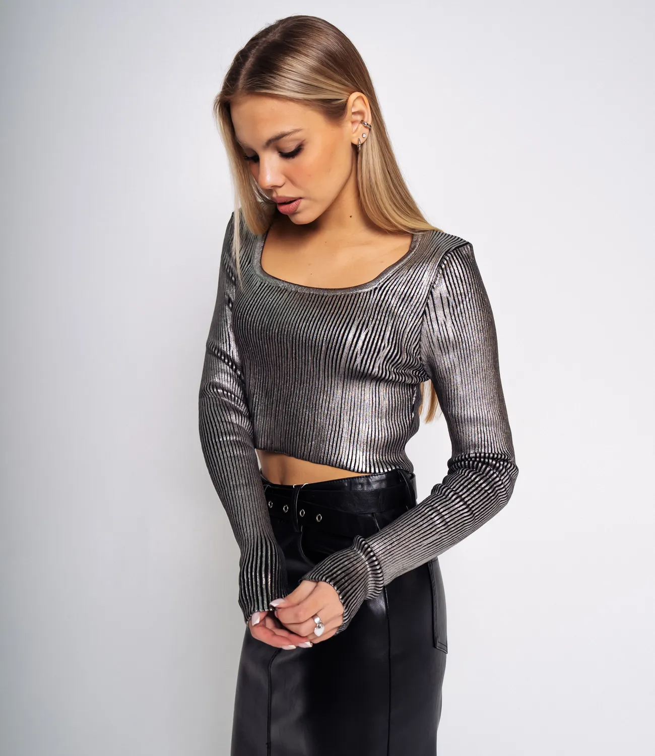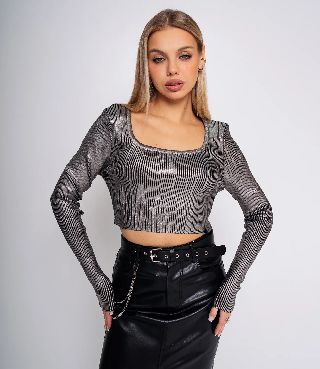 Этот металлизированный кроп-топ - воплощение смелости и стиля. С его неповторимым блеском и сиянием, вы будете заявлять о своей индивидуальности и непринужденности в мире моды.