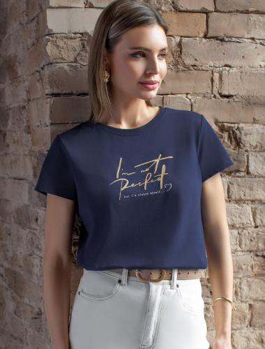 Перевод принта: "I am not perfect, but I'm always myself - я не идеальна, но я всегда настоящая". Футболка прямого кроя выполнена из 100% хлопка. Базовая модель дополнена лаконичным авторским принтом. Легко впишется в повседневный гардероб. Изделие хорошо держит форму и обеспечивает комфортный микроклимат в течение дня.