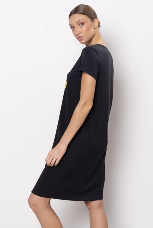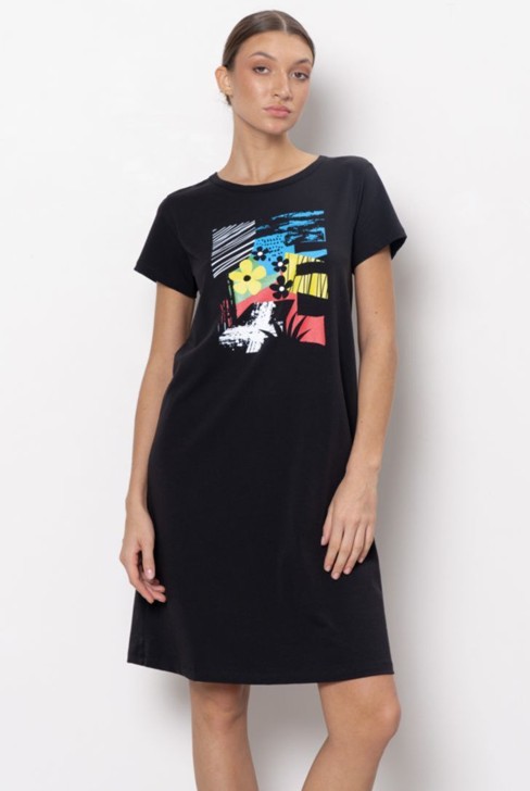 Домашнее платье – футболка с круглым вырезом горловины. Платье свободного силуэта. Модель представлена в двух цветовых решениях.