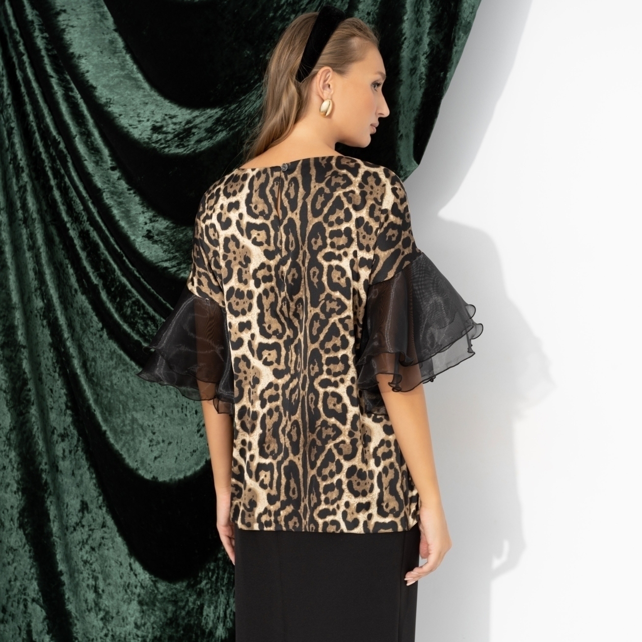 Она – как искорка: страсть и утончённость в одном движении. Леопардовый принт шепчет о дерзости, а органза добавляет лёгкости. Женственность, от которой невозможно отвести взгляд. Блуза прямого кроя, комбинированная с воланами из органзы. Отлично смотрится как в заправленном виде, так и навыпуск.