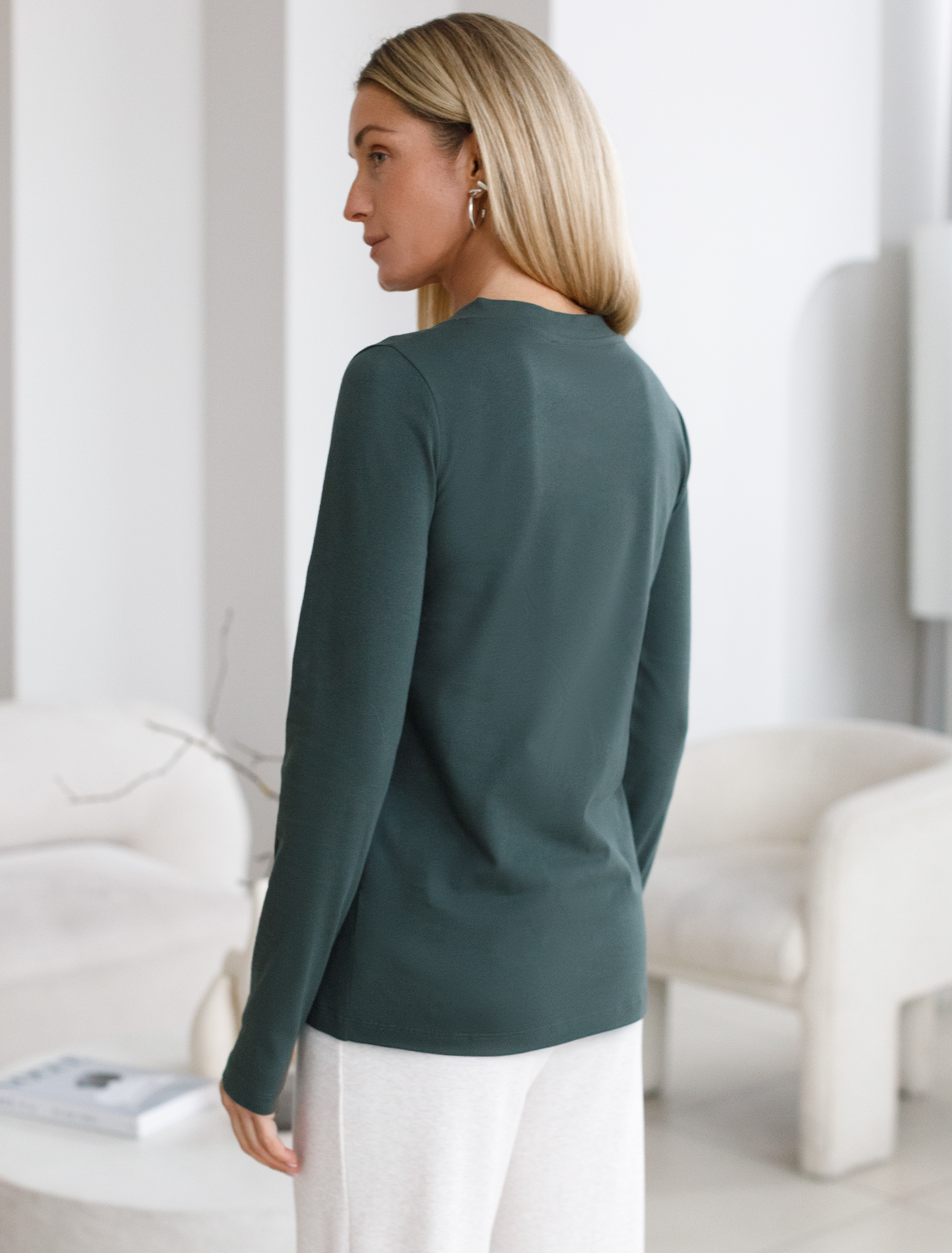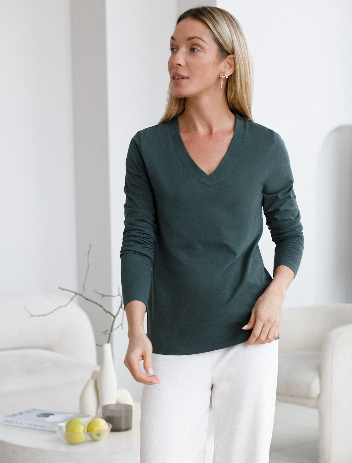 Оливковый джемпер с длинными рукавами и V-образным вырезом сшит из премиального хлопка. Однотонная хлопковая модель хорошо поддерживает комфортный для тела микроклимат. Благодаря вплетению эластановых волокон вещь хорошо сохраняет форму.