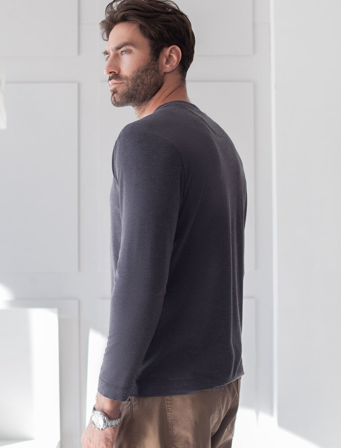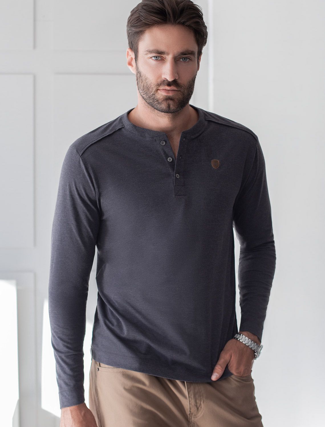 Ст.цена 1450р Тонкий лонгслив с круглым воротом на пуговицах из премиального хлопка с эластаном U49.053 т.серый меланж