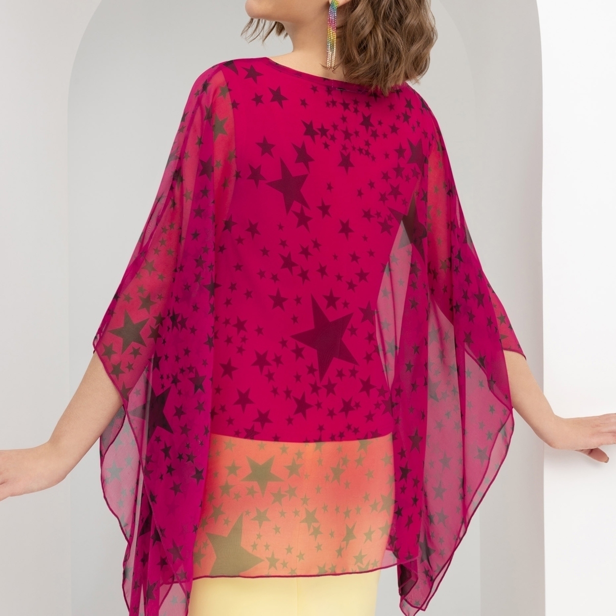 Жар софитов ощущается в воздухе. Все взгляды прикованы к вам. Ваш выход: полупрозрачная туника в цвете фуксия, усыпанная звездными принтами. «Летящая» линия рукава. Выглядите космически круто! Топ в комплекте.