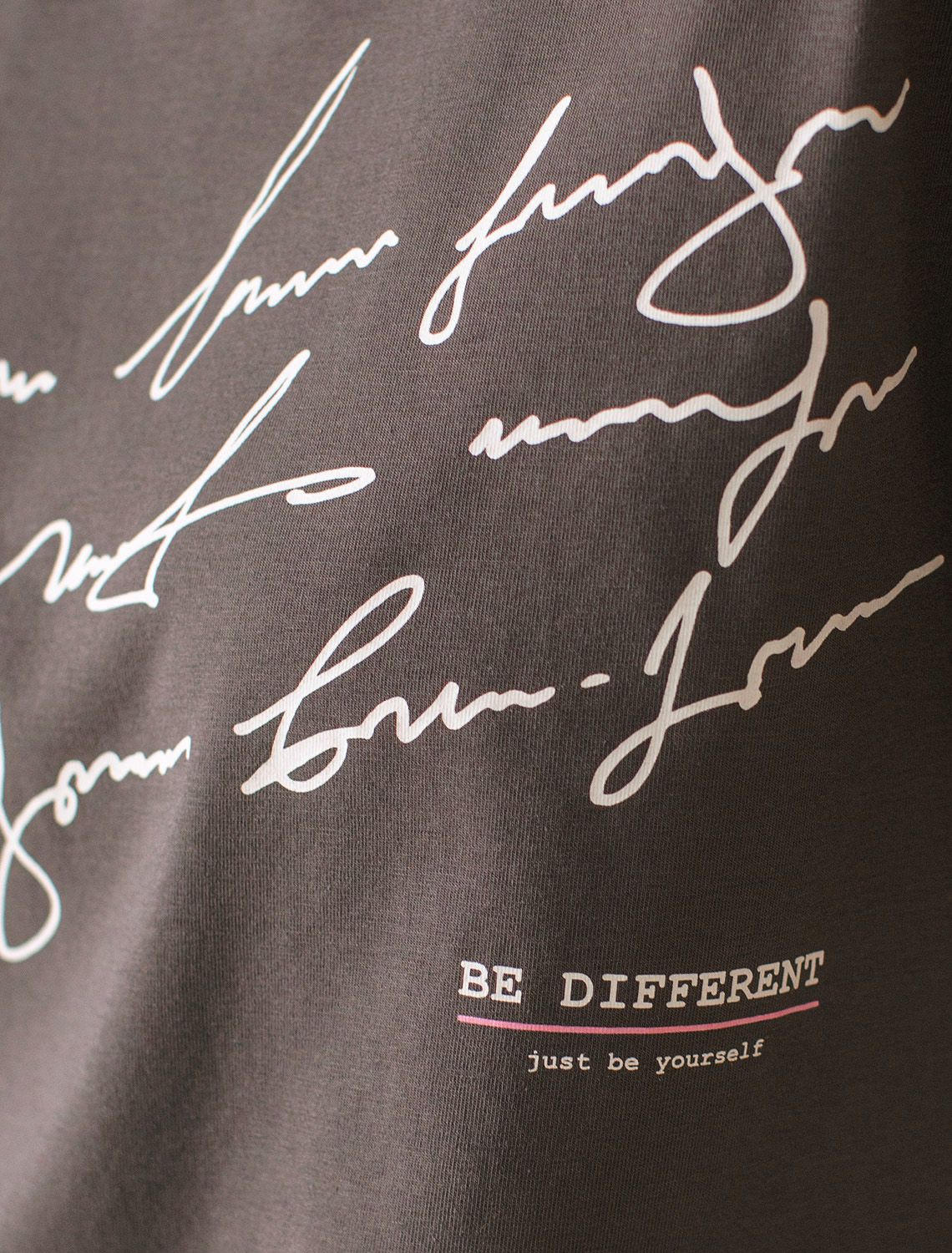 Футболка выполнена из премиального хлопка. Авторский принт нанесен красками с устойчивым покрытием. Перевод: «Be different, just be yourself - Отличайся, будь собой» Наличие эластана в составе гарантирует абсолютный комфорт и долговечность изделия. Базовая модель впишется в любой гардероб. Дополнительным украшением служит металлическим логотипом бренда.
