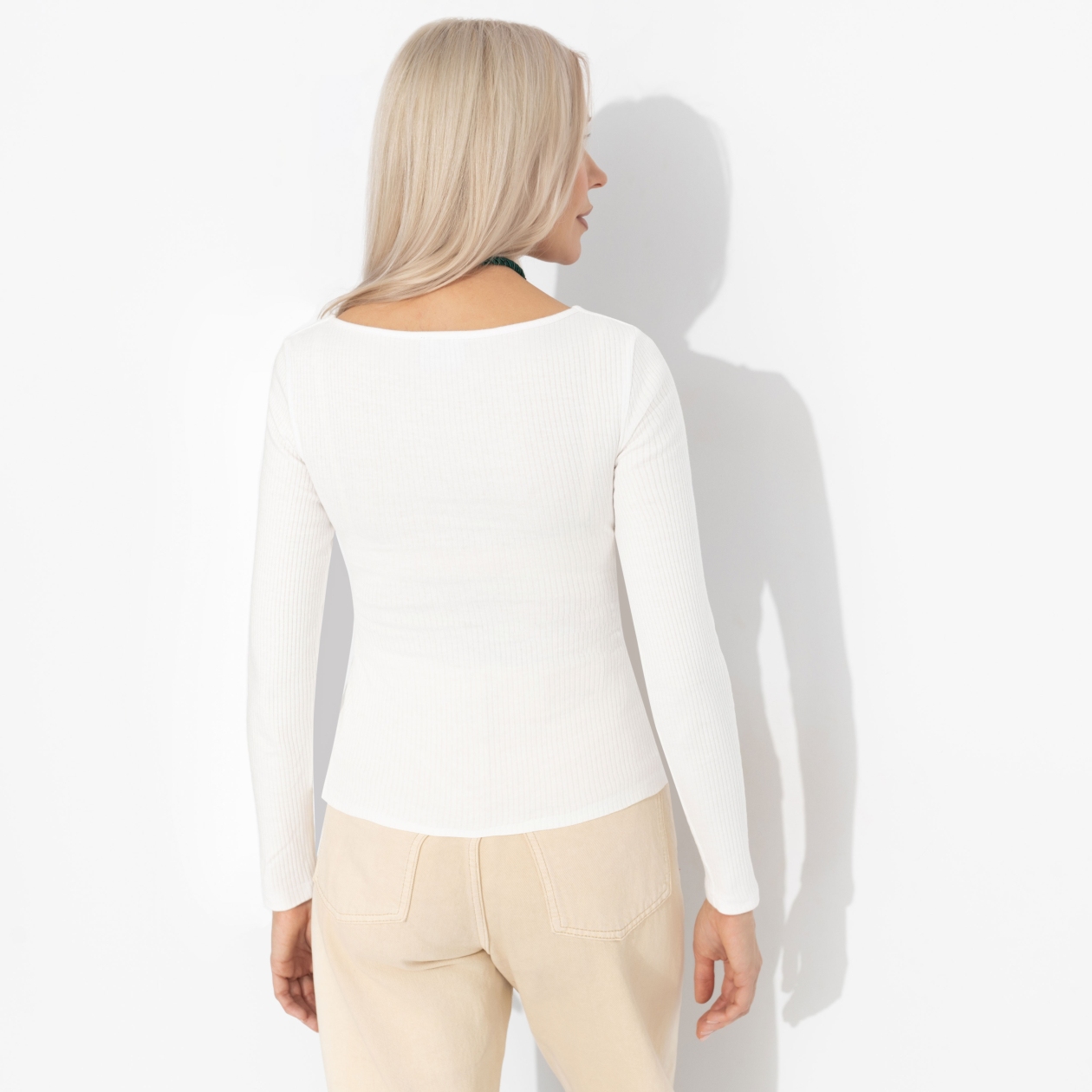 Заказ от мужской половины населения в ЧАРУТТИ – больше женственности. Заказ принят и воплощен в лонгсливе нежного молочного оттенка. Удивительно женственный, с глубокой зоной декольте и максимально комфортный. Отправляйте своим половинам! Лонгслив прилегающего силуэта. Материал изделия в рубчик. Декоративная сборка в виде узла в зоне декольте.