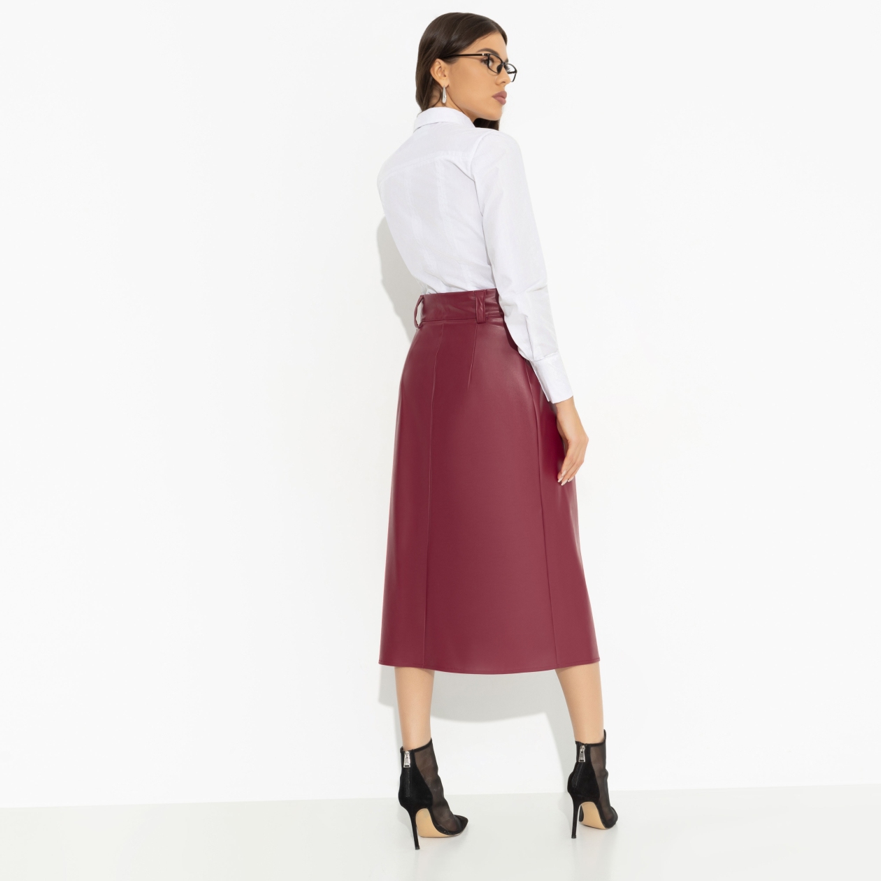 Количество экстравагантных вещей в твоем гардеробе стремительно растет. Это итог саморефлексии. Ты приняла решение быть счастливой, перестать переживать о том, что подумают другие и носить красную кожаную юбку просто потому, что тебе она нравится. Да, даже на работу. Юбка на запах в длине миди. Есть глубокий разрез. Посадка изделия на талии. Застегивается на пуговицы. Есть шлевки.