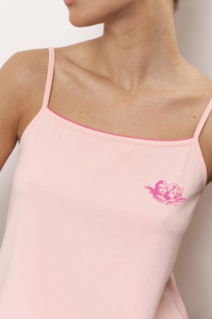Пижама состоит из топа свободного прилегания и шорт на мягком поясе. Свободный и струящийся силуэт модели не сковывает движений. Бретели топа регулируются. Модель декорирована принтом и контрастным швом «мережка». Пижама представлена в 4 цветовых решениях.