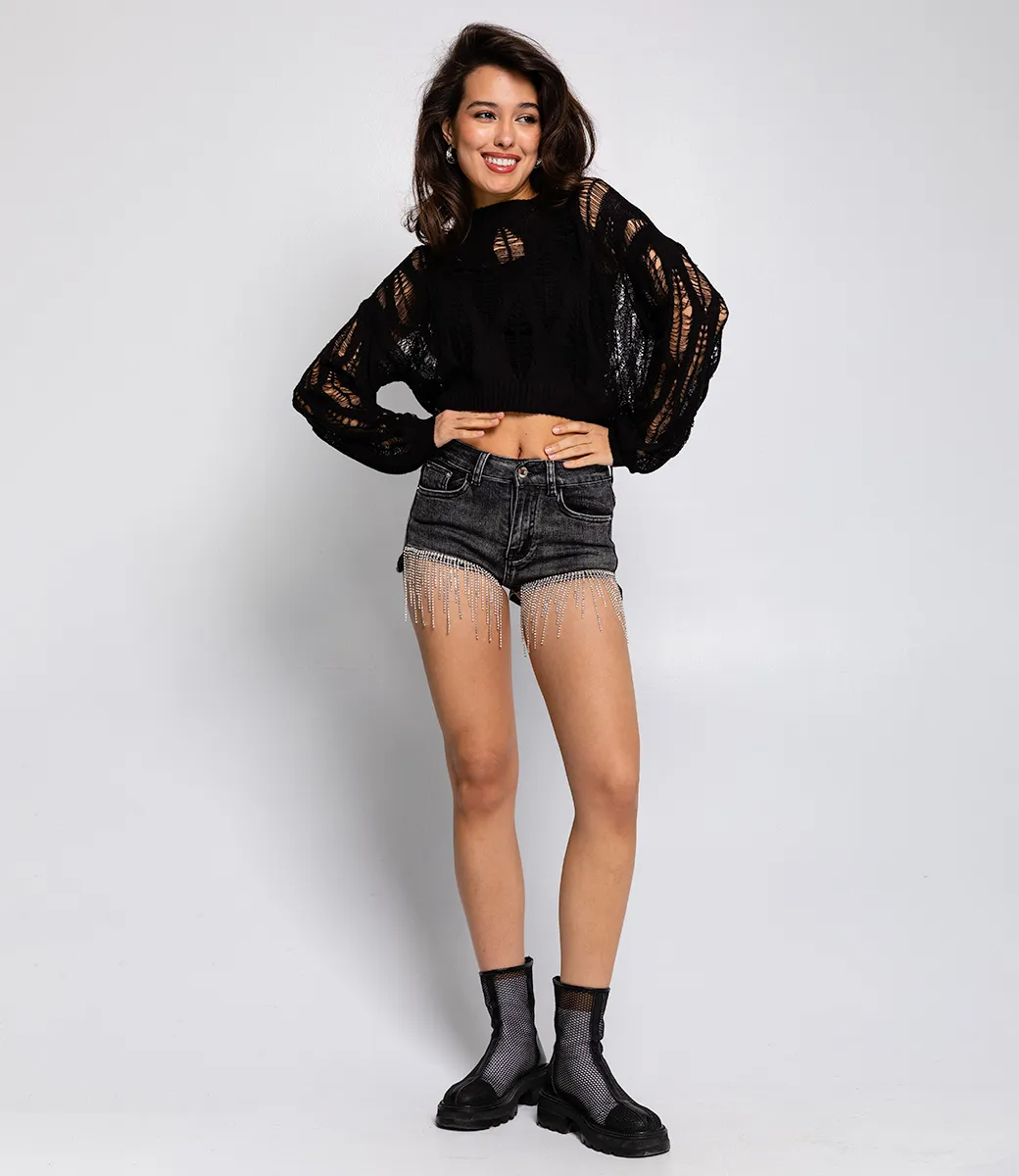 Короткие джинсовые шорты с деталью в виде свисающих страз - это модель, которая добавит яркости и стильности вашему летнему гардеробу. Джинсовые шорты являются универсальной вещью, которая подходит как для повседневного образа, так и для более праздничных событий. Деталь в виде свисающих страз придает шортам эффектный и нарядный вид. Такие шорты можно сочетать с различным верхом, от простых футболок и блузок до кроп-топов и рубашек. Создавайте летние образы, дополняя их аксессуарами, такими как сандалии, шляпы, сумки и бижутерия.