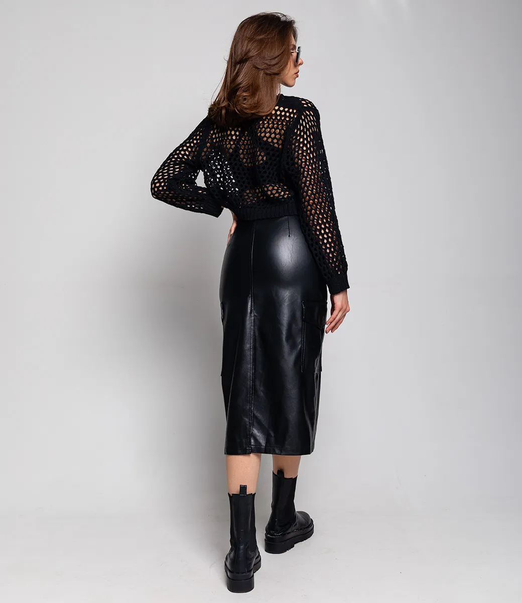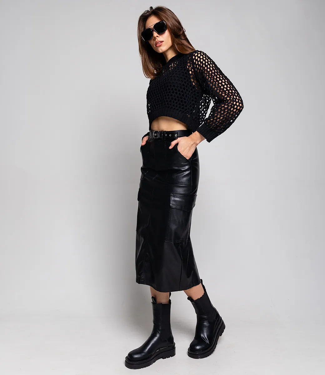 Юбка из эко-кожи с ремнем и небольшим разрезом сзади сделает образ более дерзким и притягательным.