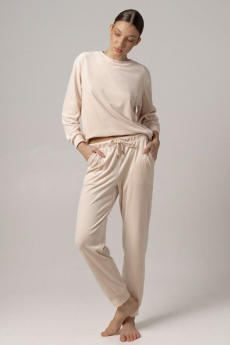 Брюки свободного прилегания, зауженные к низу. Мягкий пояс на кулисе. Пояс декорирован люверсами и бархатным шнуром с металлическими наконечниками. По низу брюк манжеты. В боковых швах функциональные карманы. Брюки представлены в двух цветовых решениях.