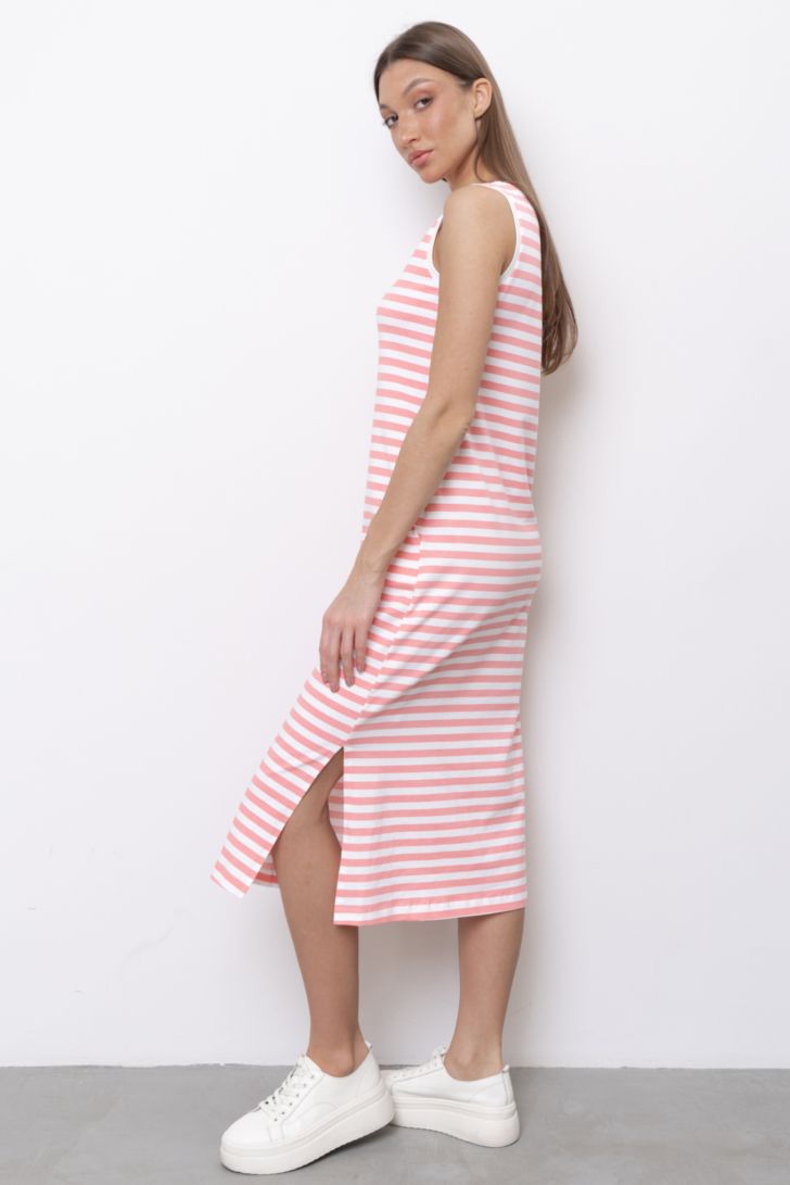 Женское летнее платье-футболка из эластичного трикотажного полотна с узором в полоску создаст готовый комфортный образ для жаркой погоды на каждый день. Данная модель имеет свободный прямой силуэт со спущенной линией плеча и короткими рукавами. Платье с карманами а боковых швах. Платье с круглым вырезом будет отлично сочетаться с открытой летней или спортивной обувью и с подходящими аксессуарами. Модель представлена в двух цветовых решениях.