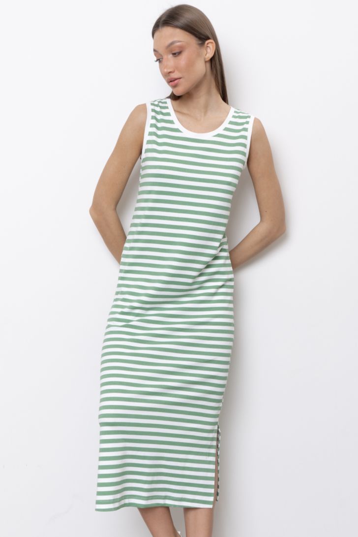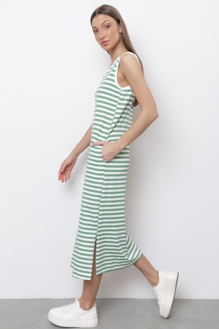 Женское летнее платье-футболка из эластичного трикотажного полотна с узором в полоску создаст готовый комфортный образ для жаркой погоды на каждый день. Данная модель имеет свободный прямой силуэт со спущенной линией плеча и короткими рукавами. Платье с карманами а боковых швах. Платье с круглым вырезом будет отлично сочетаться с открытой летней или спортивной обувью и с подходящими аксессуарами. Модель представлена в двух цветовых решениях.
