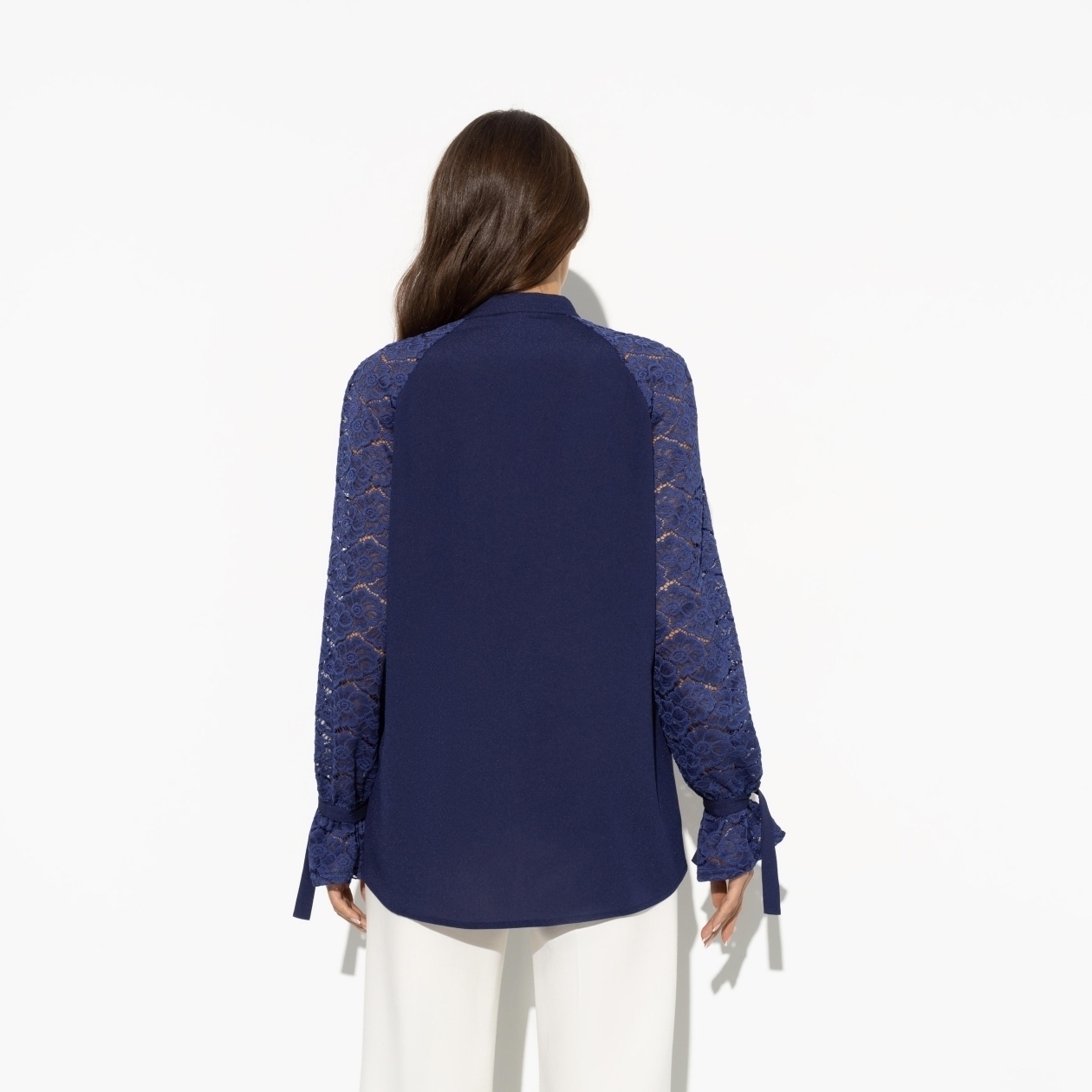 Глубина – то, что мы ищем в отношениях с миром. Погрузиться с головой, ощутить всю полноту чувств... Глубокий синий – цвет для тех, кто ценит фундаментальность жизни. Блуза свободного кроя. Идеальна для любого типа фигуры. Рукава из прозрачного кружева оформлены завязками. Легкая ткань обеспечивает струящиеся силуэт.