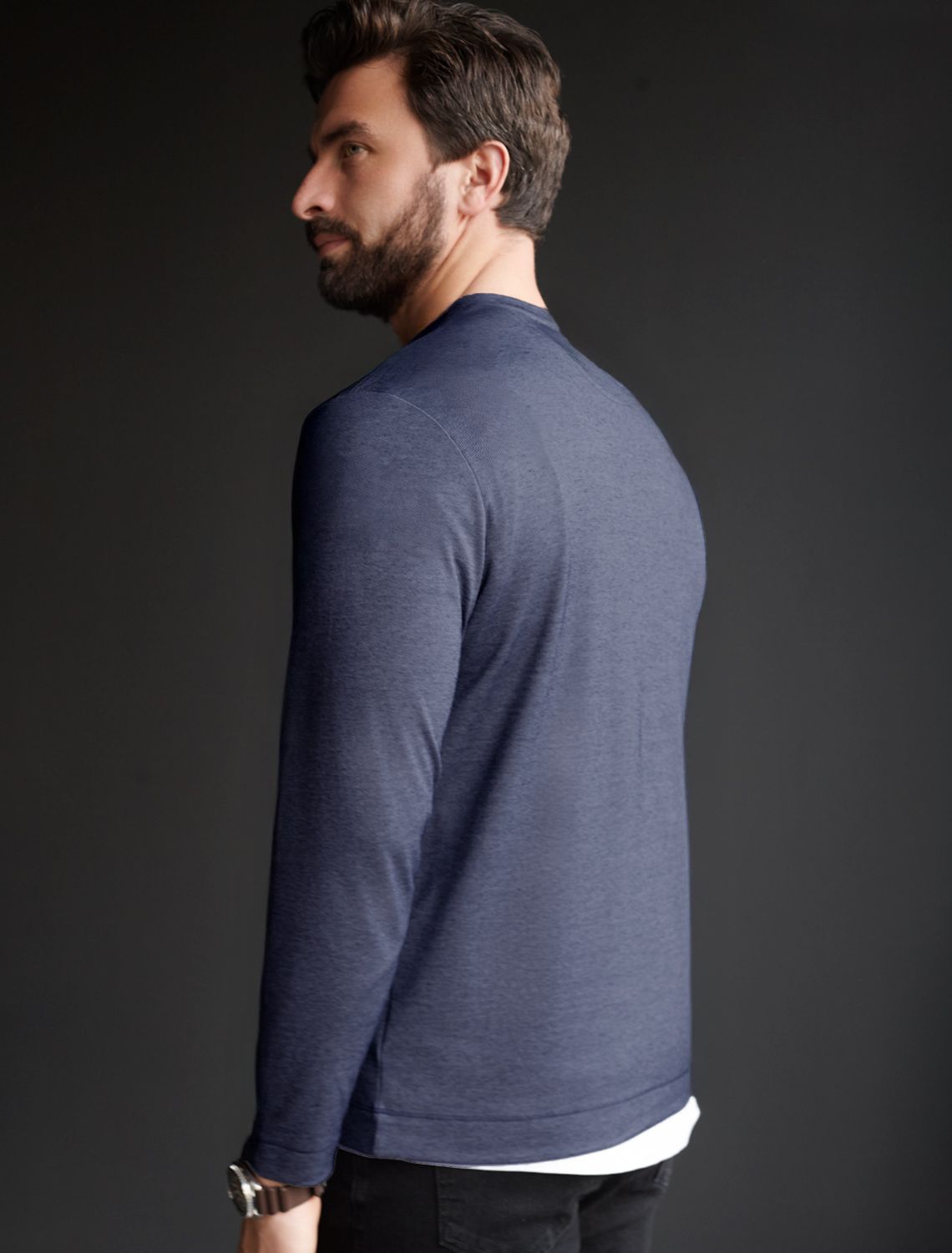 Джемпер хенли темно-синего цвета из полотна пике, состоящий из двух оттенков нити, создающем эффект меланж. Мягкая и дышащая ткань обеспечивает комфорт в течение всего дня, позволяя коже дышать и поддерживать оптимальную воздухопроницаемость. Материал тянется, обеспечивает долговечность и сохраняет презентабельный внешний вид даже после многократных стирок.
