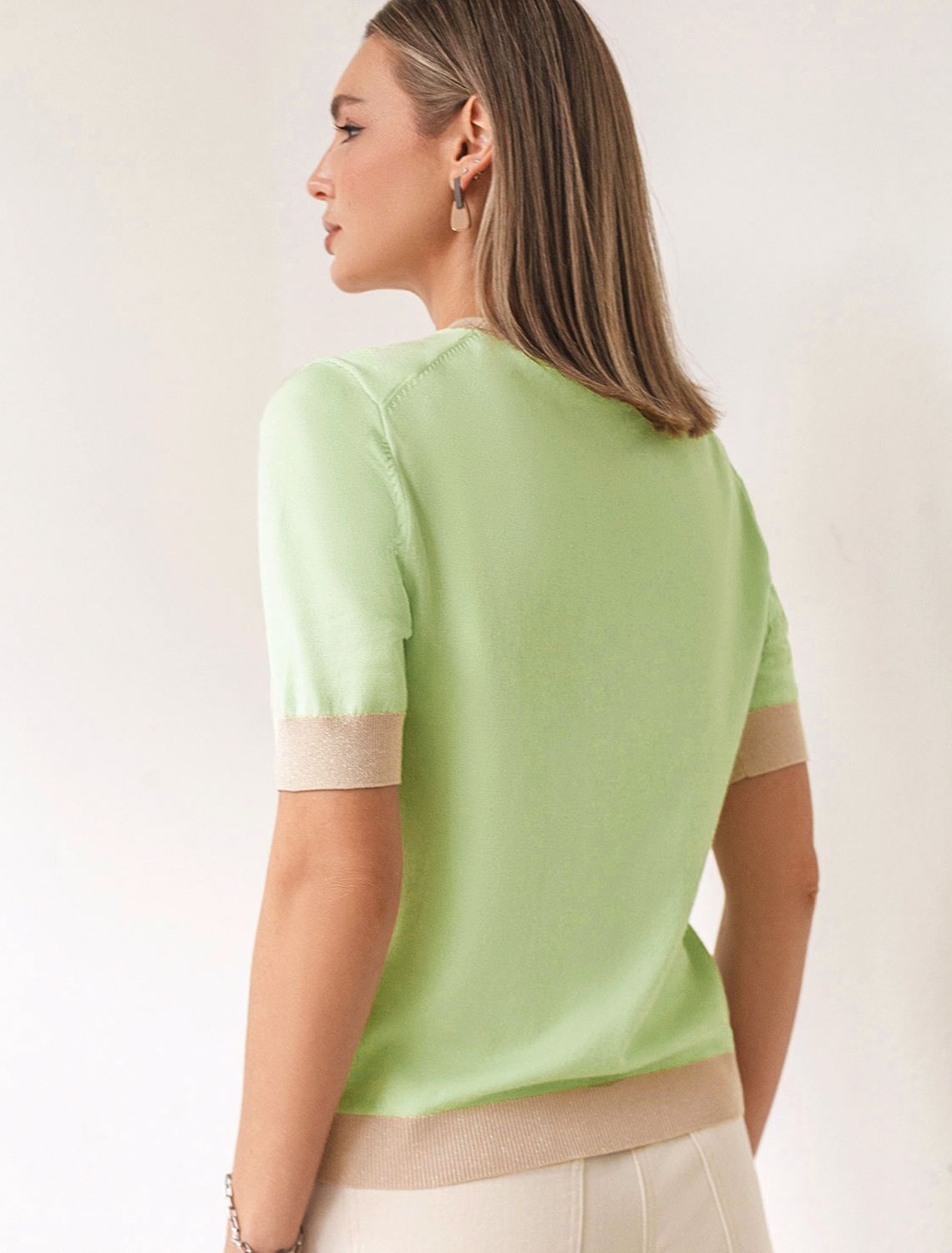 Легкий джемпер светло-зеленого цвета с круглым вырезом идеально подходит на весну и лето. Тонкая вязка из вискозы дарит приятный комфорт и ощущение свежести в теплую погоду. Полуприлегающий крой подчеркивает силуэт, а универсальная длина позволяет сочетать джемпер с разными элементами гардероба. Контрастная отделка с мягким люрексом добавляет стильный акцент, создавая выразительный образ. Деликатное мерцание придает праздничное настроение, но не выглядит слишком ярко или вызывающе. Такой элемент украшения позволяет носить нарядный джемпер и на особых мероприятиях. Джемпер отлично смотрится на больших размерах благодаря продуманному крою и полуприлегающему фасону. Этот джемпер с коротким рукавом станет незаменимой частью гардероба в сезоны, когда хочется легкости и элегантности одновременно. Лаконичный дизайн обеспечивает простоту комбинирования с другими вещами и будет универсальной базой для создания разнообразных комплектов — от офисного до непринужденного городского стиля.