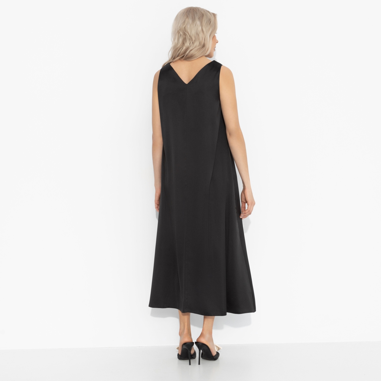 Минимализм, доведённый до совершенства. Это платье создаёт ощущение внутреннего покоя и уверенности – как будто вы уже на шаг впереди. Комфорт и элегантность здесь не спорят, а дополняют друг друга. Платье выполнено из струящегося атласа с лёгким блеском. Свободный силуэт и лаконичные детали позволяют сочетать модель с аксессуарами любого стиля. Комбинируйте с жакетами и кардиганами.