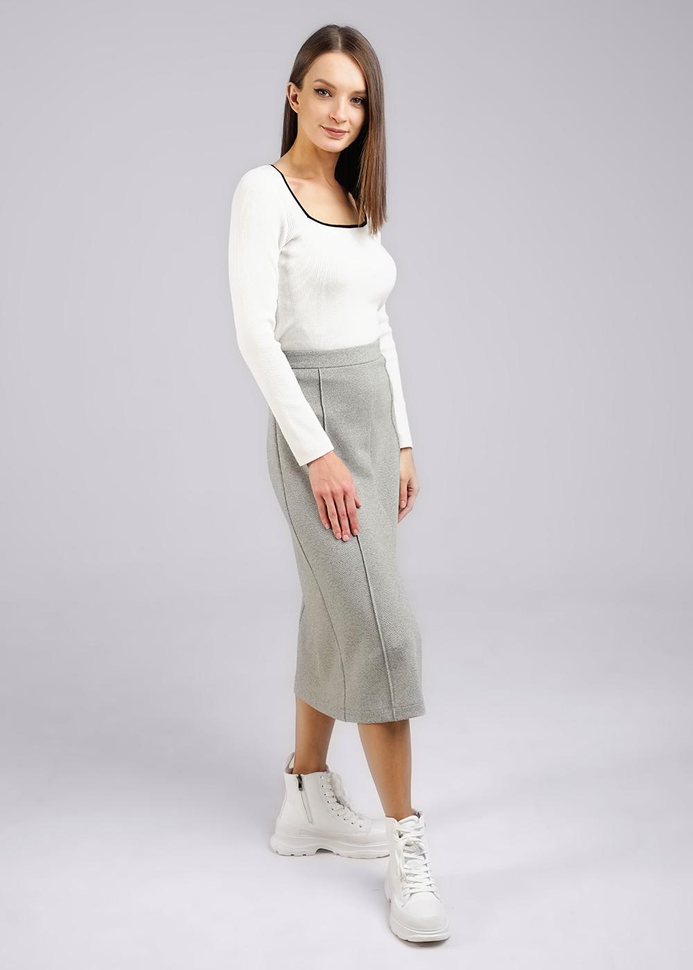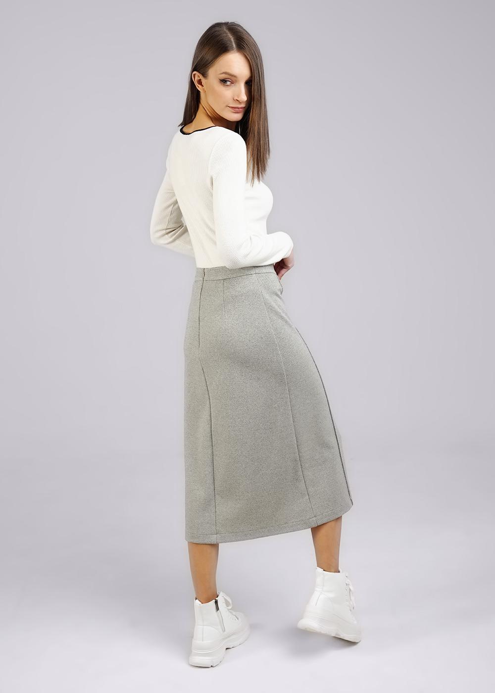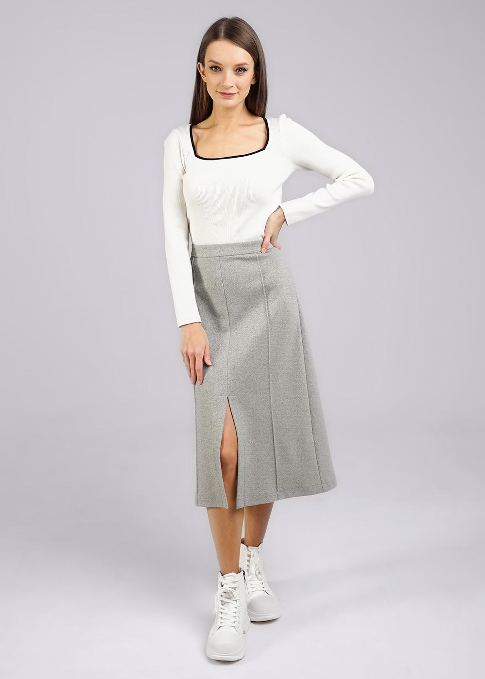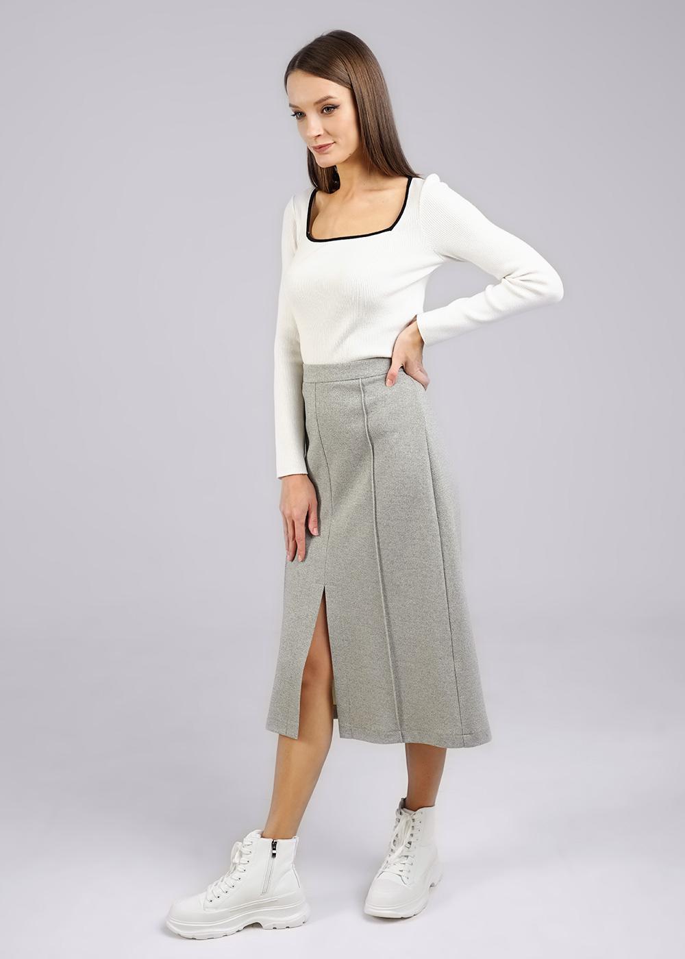Юбка миди из плотного трикотажного полотна. По талии отрезной пояс. По спинке средний шов и застежка на потайную молнию. По переду средний шов с разрезом и вертикальные декоративные защипы с отстрочкой.