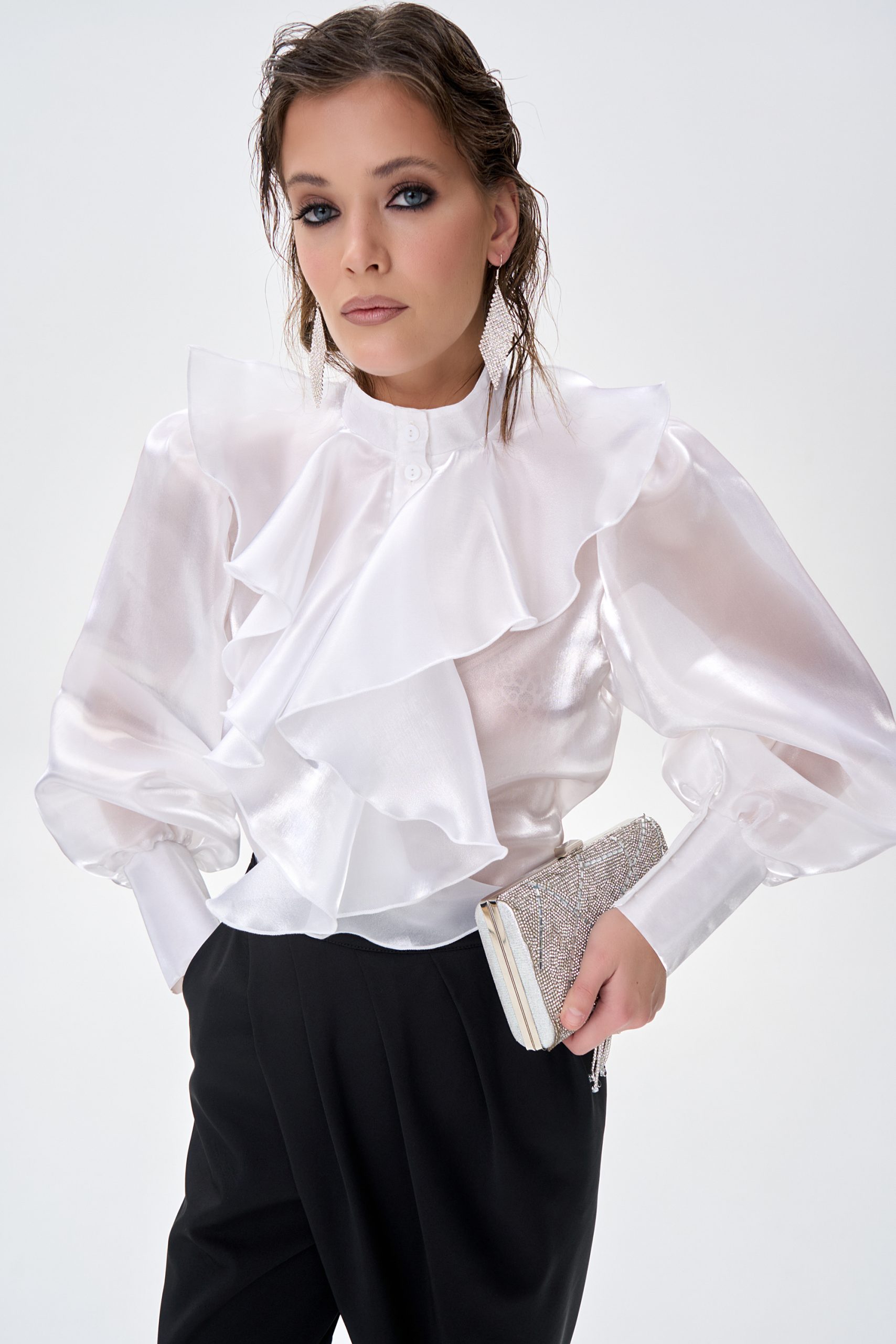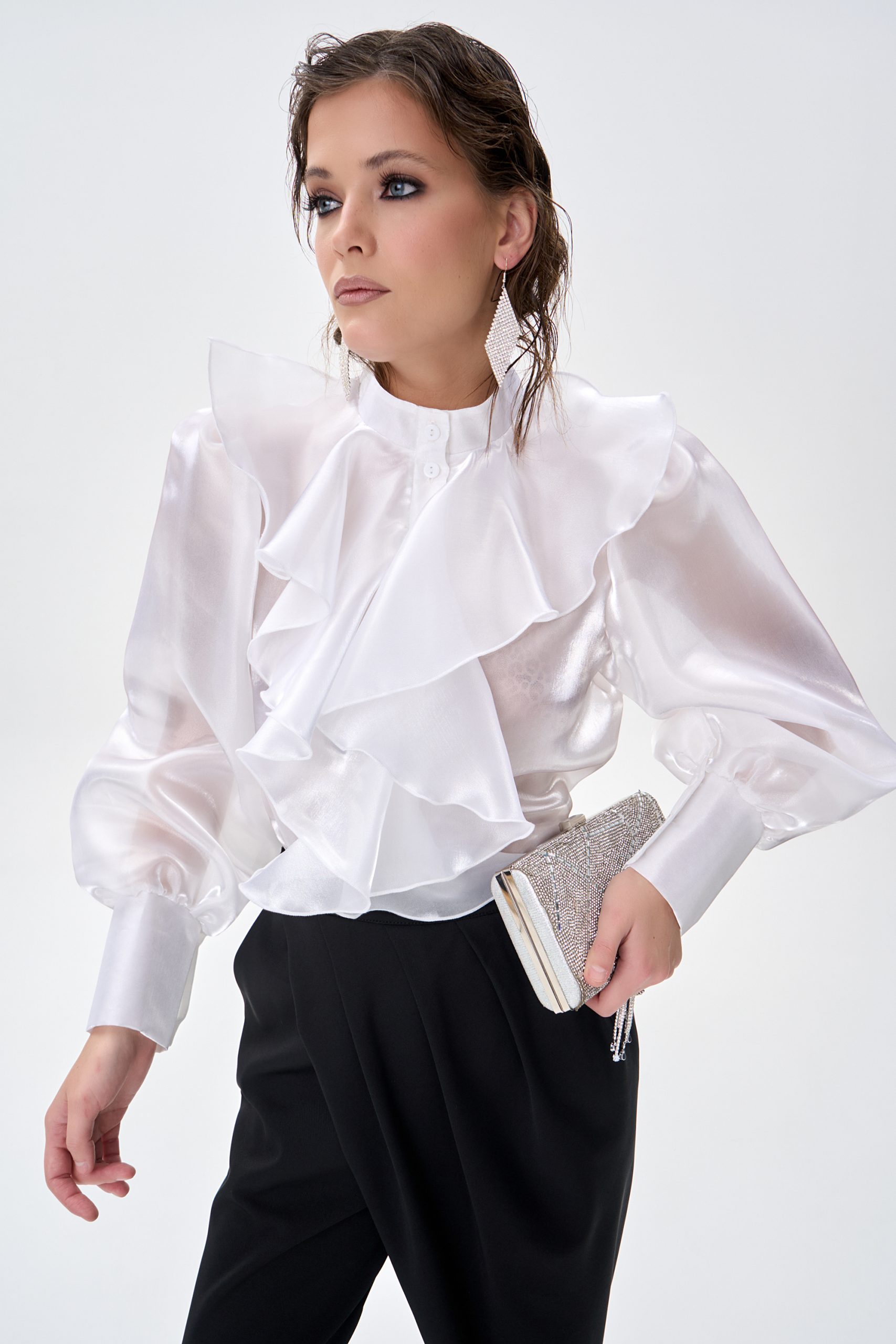Рубашка “Алиша” из премиальной органзы, выполненная из лёгкой полупрозрачной ткани с благородным сатиновым блеском. Модель выделяется выразительными объёмными оборками, которые создают многослойный декоративный эффект в зоне груди и придают образу утончённую архитектурность.