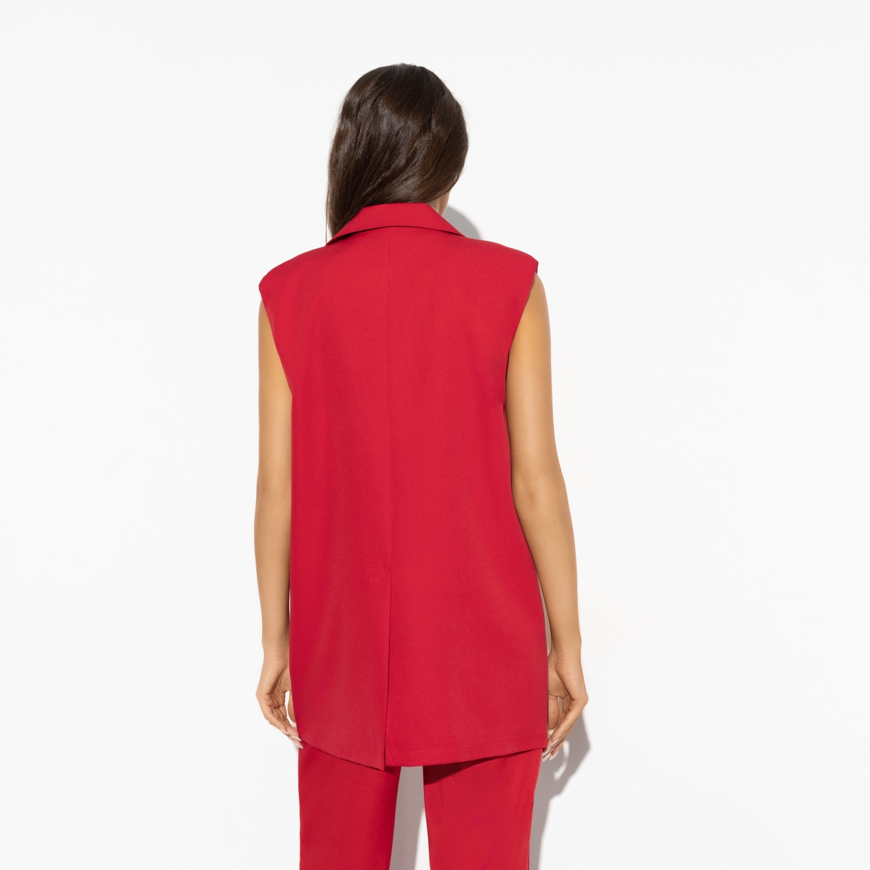Новое экстравагантное прочтение любимца звезд street-style – жилета. Революционный красный, oversize-крой, интригующий вырез. Абсолютная гарантия попадания в объективы папарацци. Жилет с лацканами в красном цвете. Вшиты подплечники. Длина жилета до линии бедра. Имитация карманов. Акцентные пуговицы.