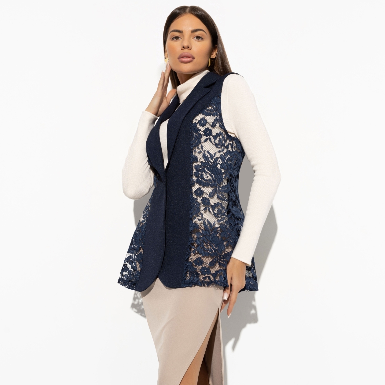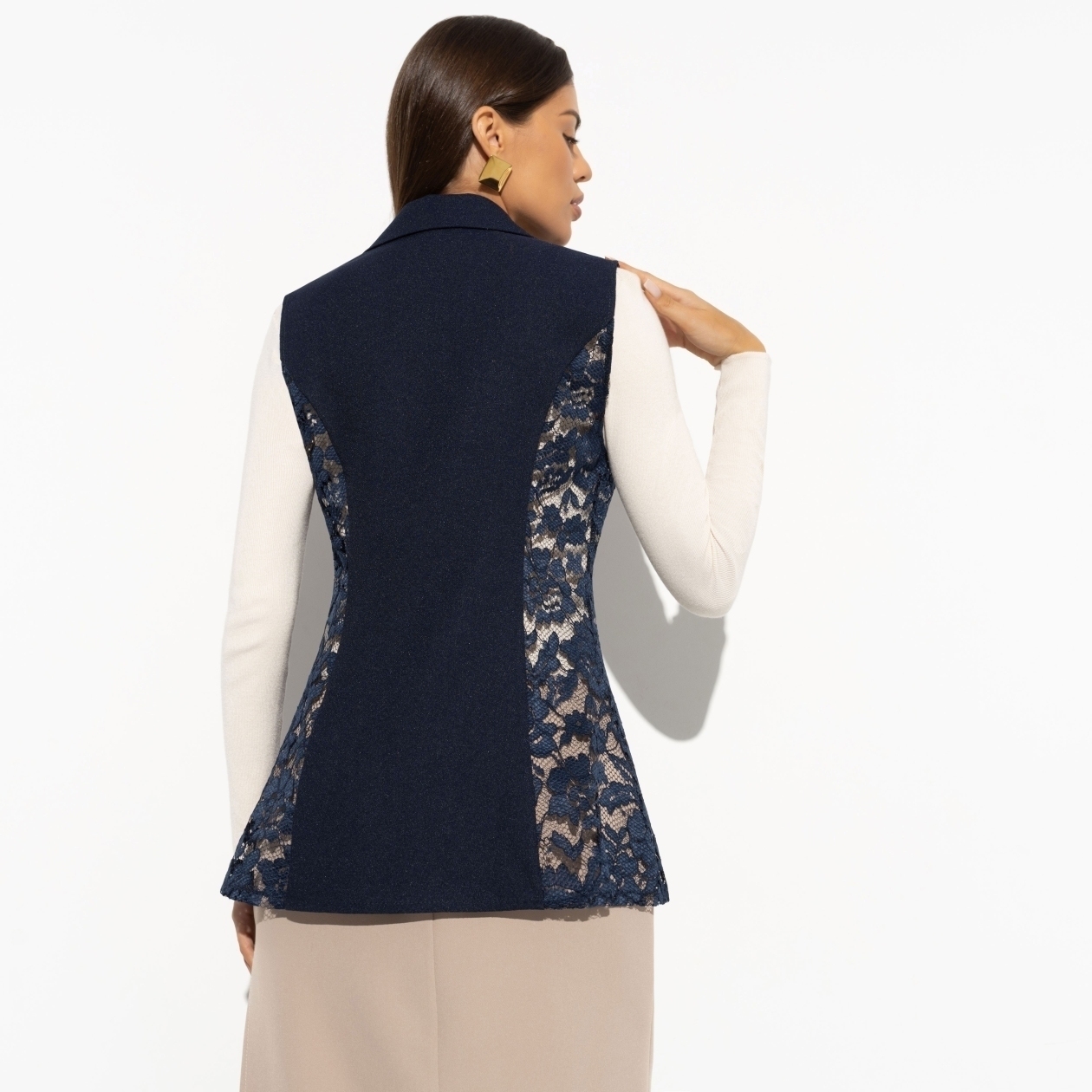 Проведенный среди мужчин опрос показал, что из всех видов ткани, кружево считается максимально привлекательным материалом. Не то, чтобы мы этого не знали, но выводы сделаем. Будем носить кружево на работу в виде жилета ЧАРУТТИ. Жилет приталенного силуэта с лацканами глубокого синего цвета. Застегивается на акцентную пуговицу. Длина изделия чуть ниже линии бедра.
