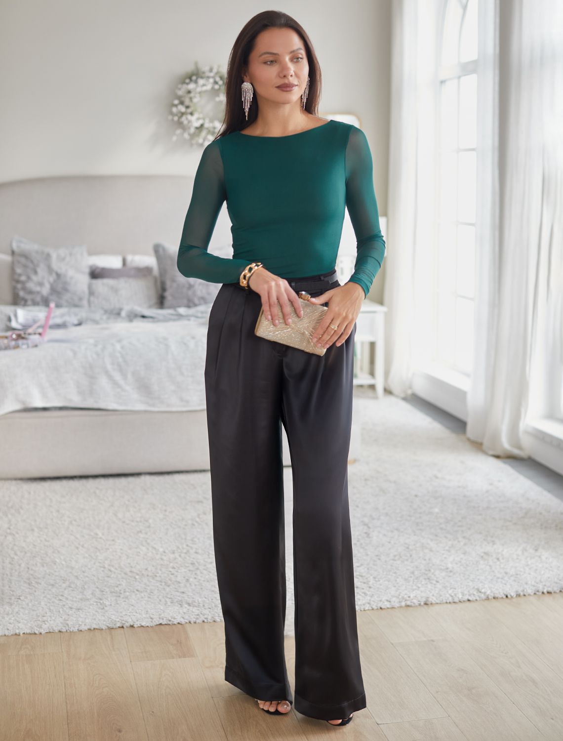 Джемпер с вырезом лодочкой и прозрачными рукавами создает женственный и элегантный образ. Тело джемпера изумрудного цвета выполнено из плотного вискозного трикотажа, обеспечивающего комфорт, в то время как рукава из тонкой сетки создают стильный контраст. Глубокий вырез лодочка подчеркивает линию плеч и создает элегантный силуэт. Идеальный выбор для стильных образов!