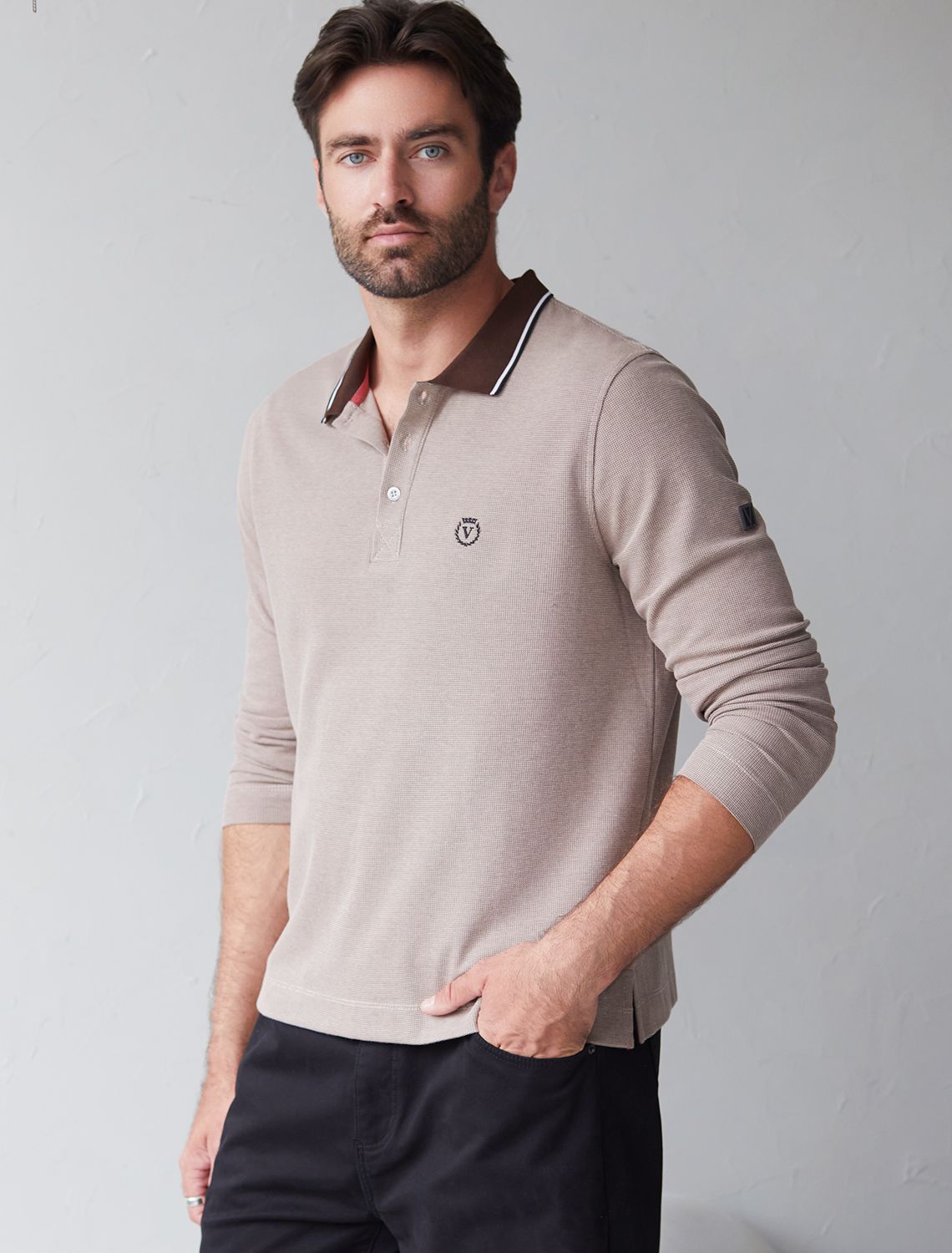 Стильный лонгслив коричневого цвета с плетеным воротником поло с застежкой на пуговицы выполнен из премиального хлопка в сочетании с эластаном .Невероятно мягкая ткань из натуральных волокон - она едва ощутима на коже и словно обнимает тело. Материал при касании кажется бархатистым, при движении он словно повторяет все мельчайшие линии фигуры. По свойствам материал сочетает в себе практичность и нежность: отлично провускает воздух, сохраняя ощущение свежести в течение всего дня, при этом созраняет тепло в прохладную погоду.Идеально подходит для чувствительной кожи, не вызывает раздражения и дискомфорта. Удобный отложной воротник делает образ современным и стильным, а длинные рукава с манжетами защищают руки при ветреной погоде.