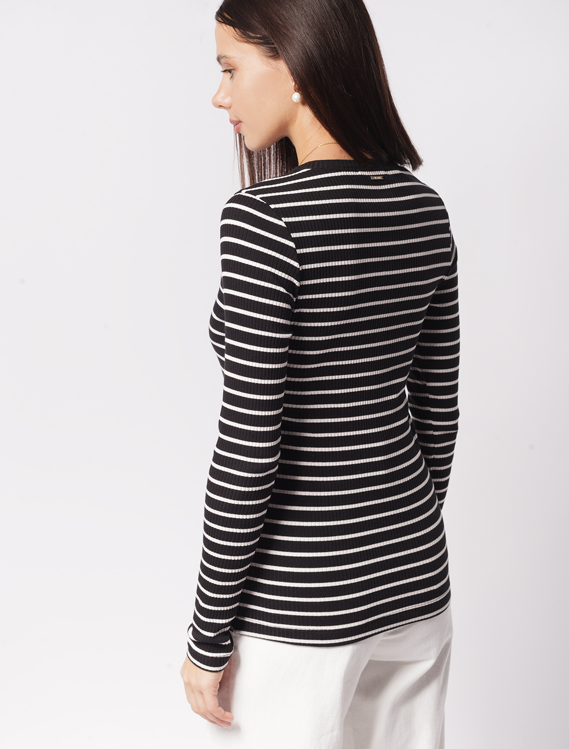 Лонгслив с узким рукавом выполнен из трикотажа в широкий рубчик. Мягкий и эластичный трикотаж безупречно держит форму и комфортно сидит по фигуре, не сковывая движения. Модель дополнена металлическим логотипом бренда.